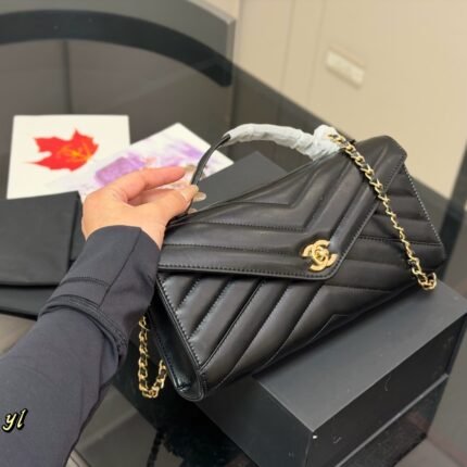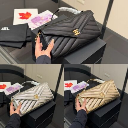 Chanel Chevron V-Quilted Top Handle Long Box Bag | Black/Gold & Metallic Chain Crossbody Bag (Multi-Color Available)