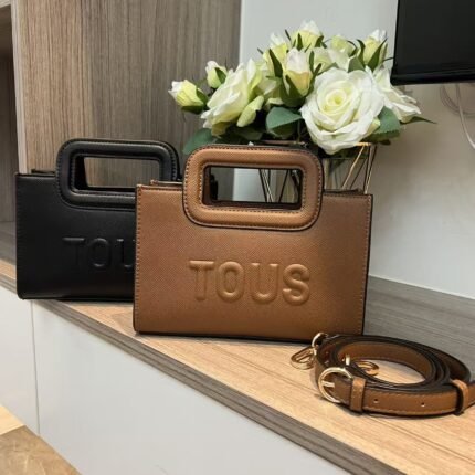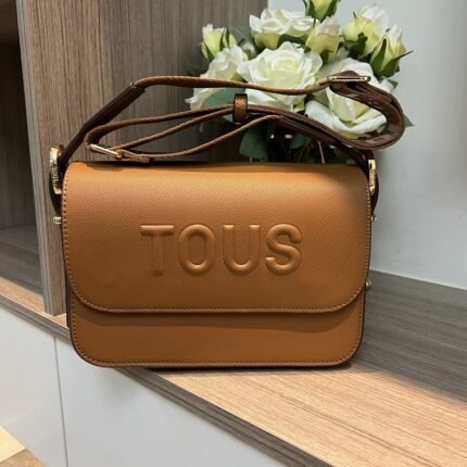 This TOUS handbag, sized at 21×14×8cm, showcases the brand’s iconic embossed logo on premium leather, offering a structured silhouette with