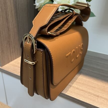 TOUS Embossed Logo Messenger Bag – Caramel Brown Leather Shoulder & Crossbody Bag, Light Luxury Retro-Style Women’s Bag