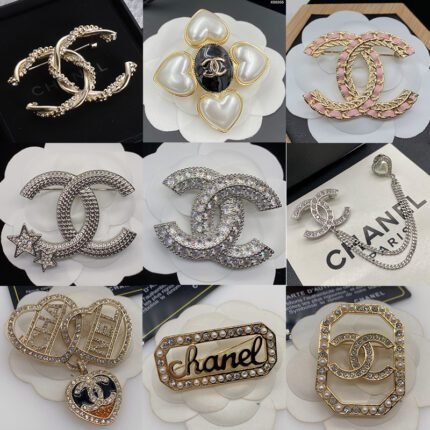 Fashionable and versatile white heart-shaped flower brooch, white gold chain zircon double C heart-shaped brooch, gold long plate polygonal long plate hollow letter design brooch