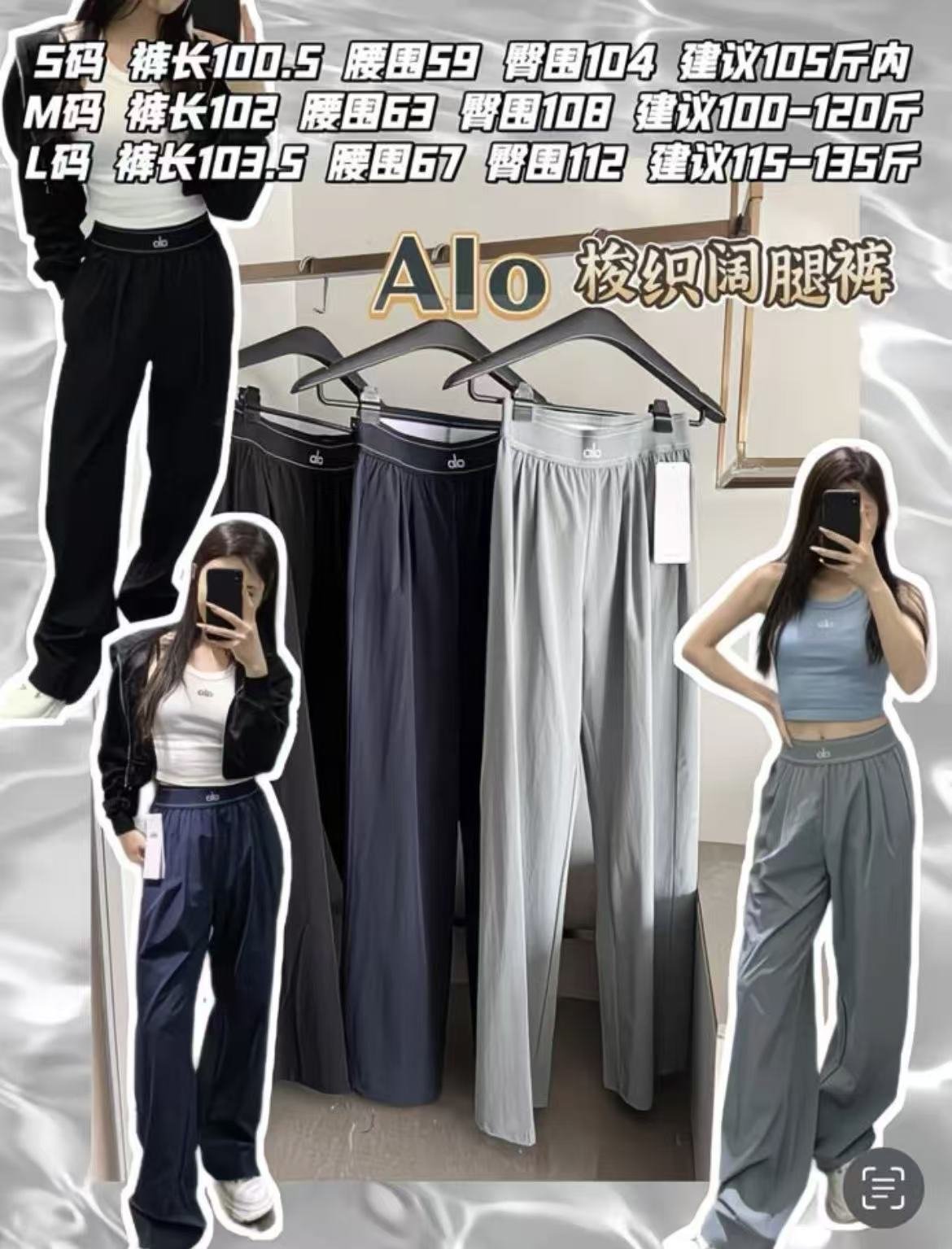 - S: Inseam 100.5cm, Waist 59cm, Hip 104cm, Recommended for under 52kg
