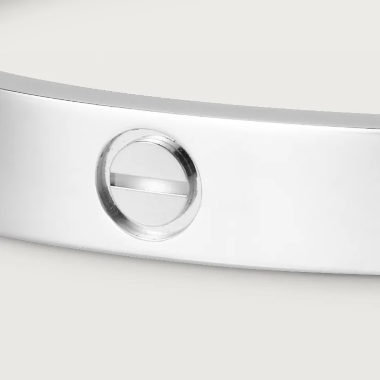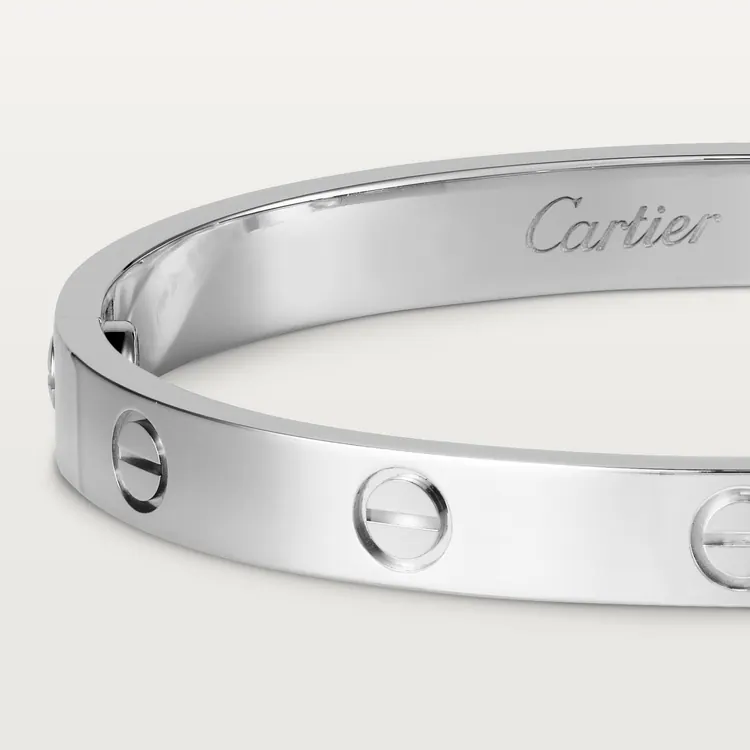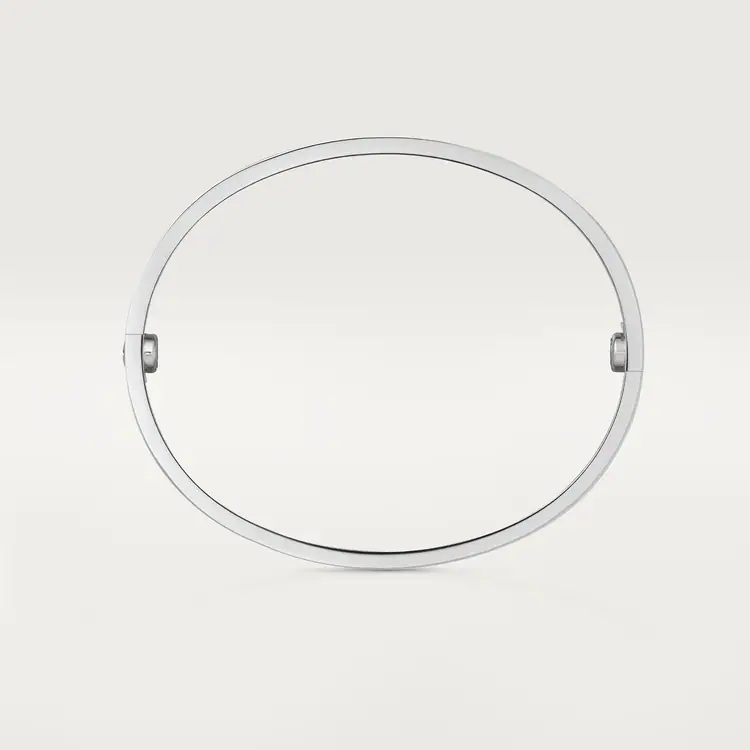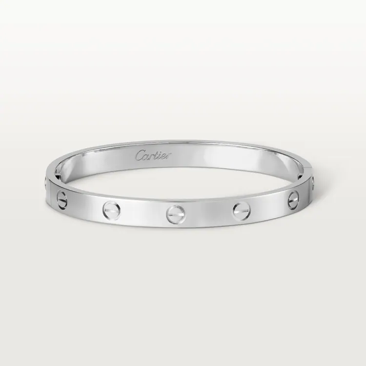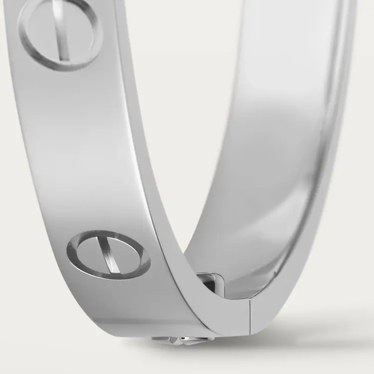 LOVE bracelet, white gold (750/1000). Comes with a screwdriver. Width: 6.1 mm. Created in New York in 1969, the LOVE bracelet is an icon of jewelry design: a close fitting, oval bracelet composed of two rigid arcs which is worn on the wrist and removed using a specific screwdriver. The closure is designed with two functional screws placed on either side of the bracelet: you will need help to open or close it. To determine the size of your LOVE bracelet, measure your wrist, adding one centimeter to your size for a tighter fit, or two centimeters for a looser fit.
