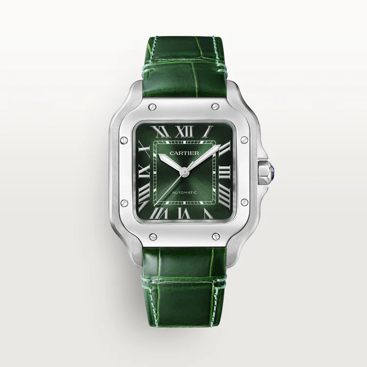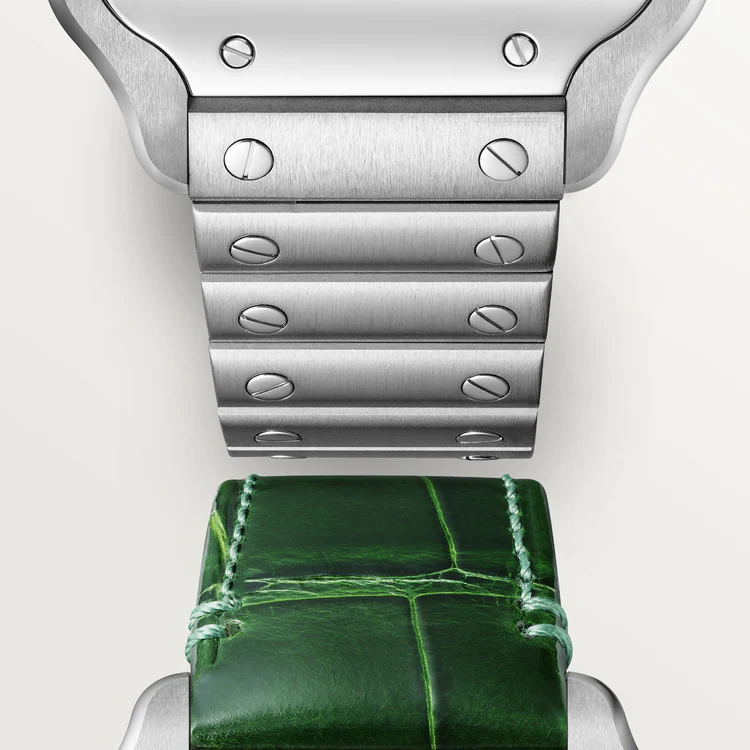 Santos de Carter watch, medium model, mechanical movement with automatic winding 1847 MC. Steel case, 7-sided crown with synthetic faceted blue spinel, graduated green dial, polished steel sword-shaped hands with luminescent material, sapphire crystal. Steel bracelet with SmartLink adjustment system. Second strap in green alligator skin, with interchangeable steel folding buckle. Both are fitted with the QuickSwitch interchangeable system. Case width: 35.1 mm, thickness: 8.83 mm. Water-resistant up to 10 bar (approx. 100 meters/330 feet).