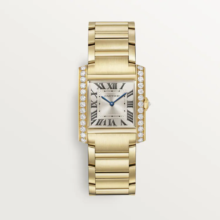 Tank Française watch, medium model, quartz movement. Case and faceted crown in 18K yellow gold (750/1000) set with 27 brilliant-cut diamonds totaling 1.22 carats. Golden sunray dial, blued-steel sword-shaped hands, sapphire crystal. Bracelet in 18K yellow gold (750/1000). Case dimensions: 32 mm x 27 mm, thickness: 7.1 mm. Water-resistant up to 3 bar (approx. 30 meters/100 feet).