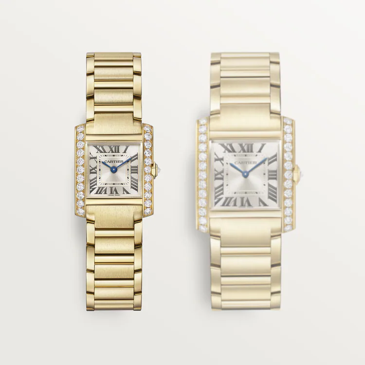 Tank Française watch, small model, quartz movement. Case and faceted crown in 18K yellow gold (750/1000) set with 23 brilliant-cut diamonds totaling 0.78 carats. Golden sunray dial, blued-steel sword-shaped hands, sapphire crystal. Bracelet in 18K yellow gold (750/1000). Case dimensions: 25.7 mm x 21.2 mm, thickness: 6.8 mm. Water-resistant up to 3 bar (approx. 30 meters/100 feet).