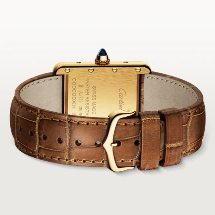 Tank Louis Cartier watch, small model, quartz movement. 18K yellow gold (750/1000) case, beaded crown set with a sapphire cabochon, silver-grained dial, blued-steel sword-shaped hands, mineral crystal, alligator-skin strap 18K yellow gold (750/1000) ardillon buckle. Case dimensions: 29.5 mm x 22 mm, thickness: 6.35 mm. Water-resistant up to 3 bar (30 meters/100 feet).