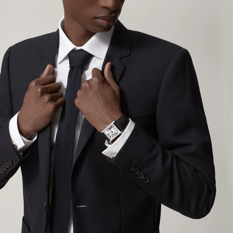 Tank Must watch, extra-large model, Manufacture mechanical movement with automatic winding, caliber 1847 MC. Steel case, beaded crown set with a synthetic cabochon-shaped spinel, silvered flinqué dial, blued-steel sword-shaped hands, interchangeable black grained calfskin strap, interchangeable steel deployant buckle, calendar aperture at 6 o’clock. Case dimensions: 41 mm x 31 mm, thickness: 8.4 mm. Water-resistant up to 3 bar (approx. 30 meters/100 feet).
