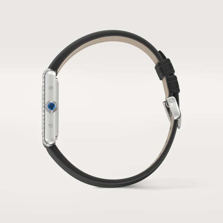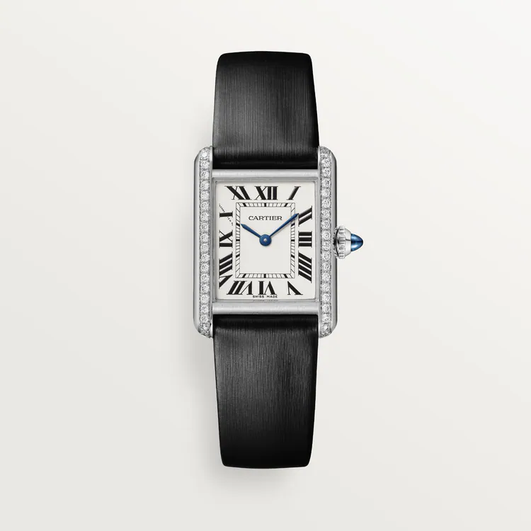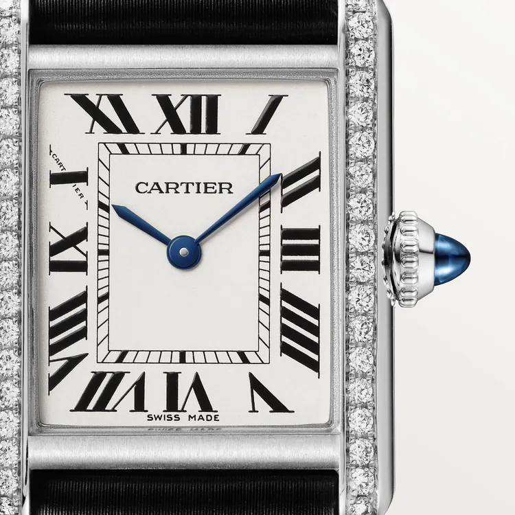 Tank Must watch, small model, high autonomy quartz movement. Steel case, bezel set with 40 brilliant-cut diamonds totaling 0.39 carats, beaded crown set with a synthetic cabochon-shaped spinel, silvered dial, blued-steel sword-shaped hands, interchangeable black brushed calfskin strap, steel ardillon buckle. Case dimensions: 27 mm x 22 mm, thickness: 6.6 mm. Water-resistant up to 3 bar (approx. 30 meters/100 feet).