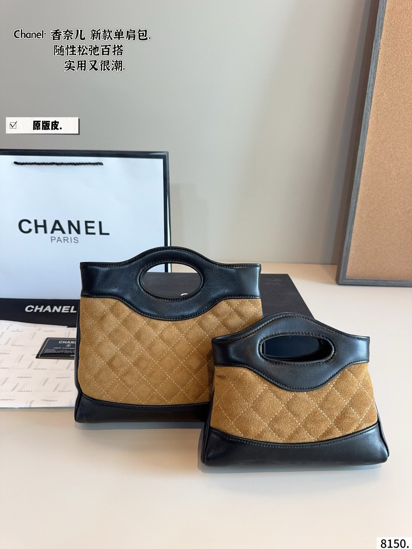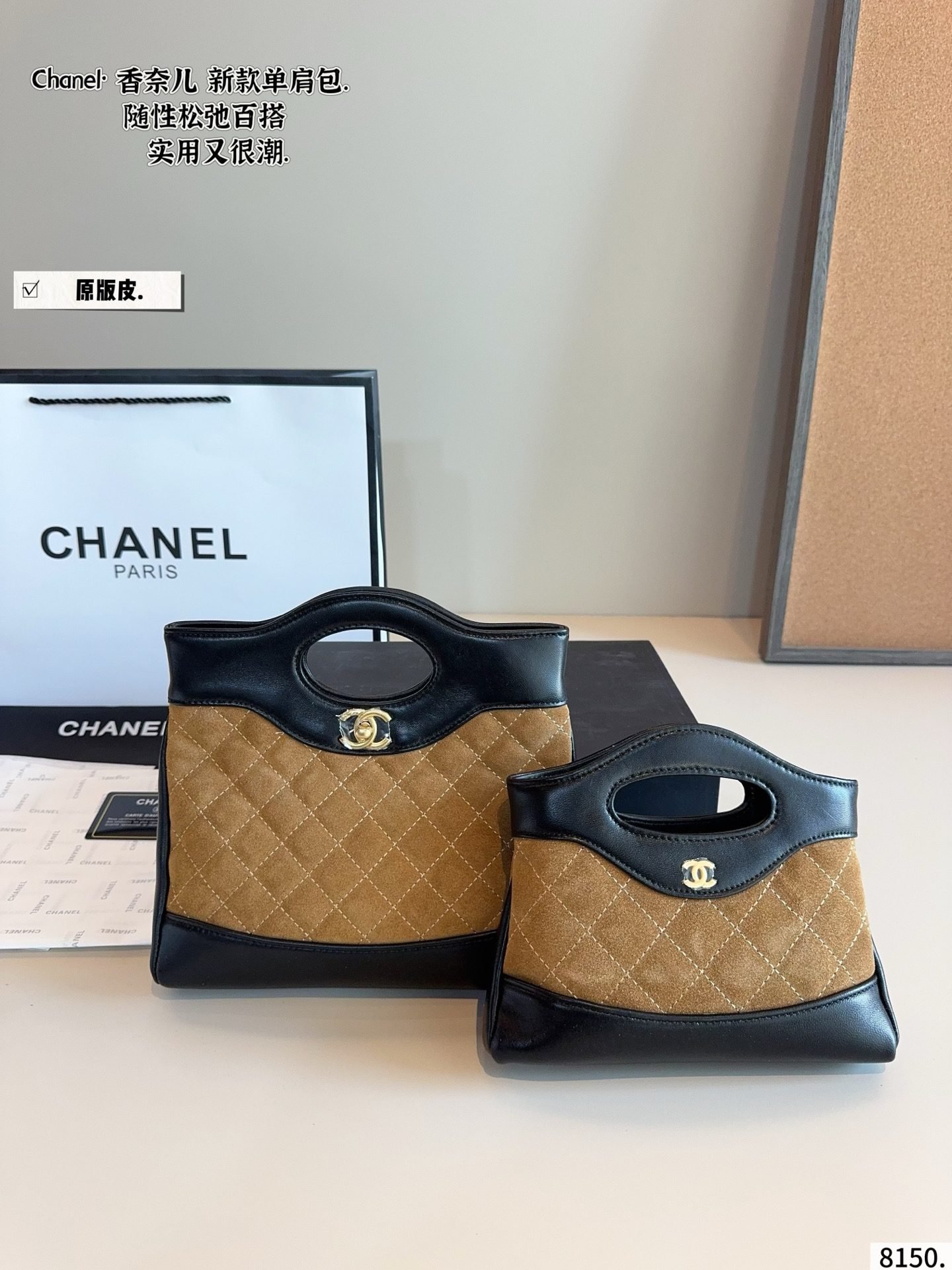 This Chanel bag set showcases premium suede and leather craftsmanship, featuring the iconic diamond quilting, signature gold CC hardware, and a versatile top handle design. Available in two sizes (large:23×5×20cm, small:19×5×12cm) with a sophisticated tan suede and black leather combination, these bags embody Chanel’s legacy of timeless elegance and functional luxury. Perfect for those who appreciate a fusion of plush suede texture, iconic branding, and versatile sizing, they make a refined statement suitable for any occasion, from daily outings to upscale events.