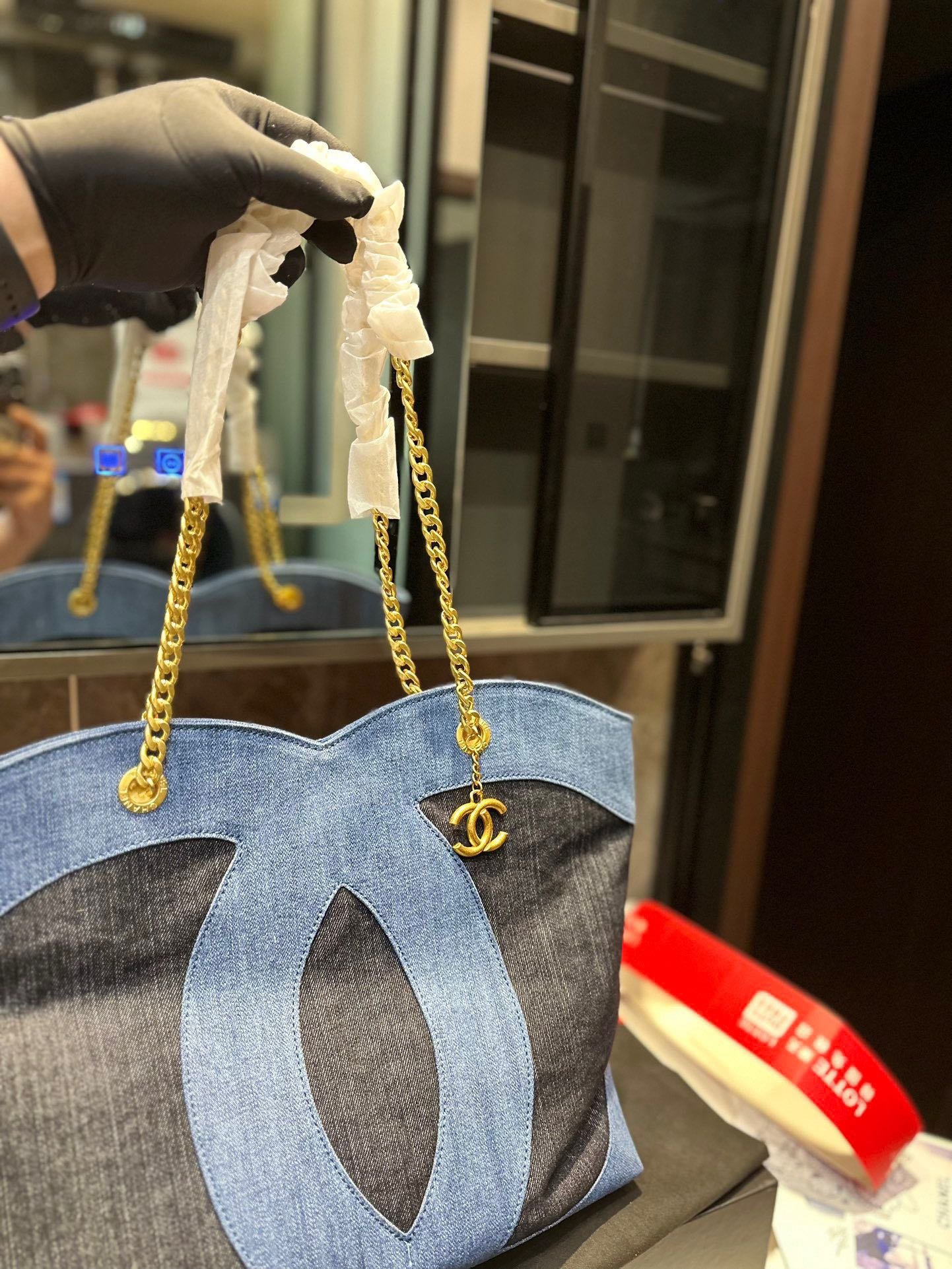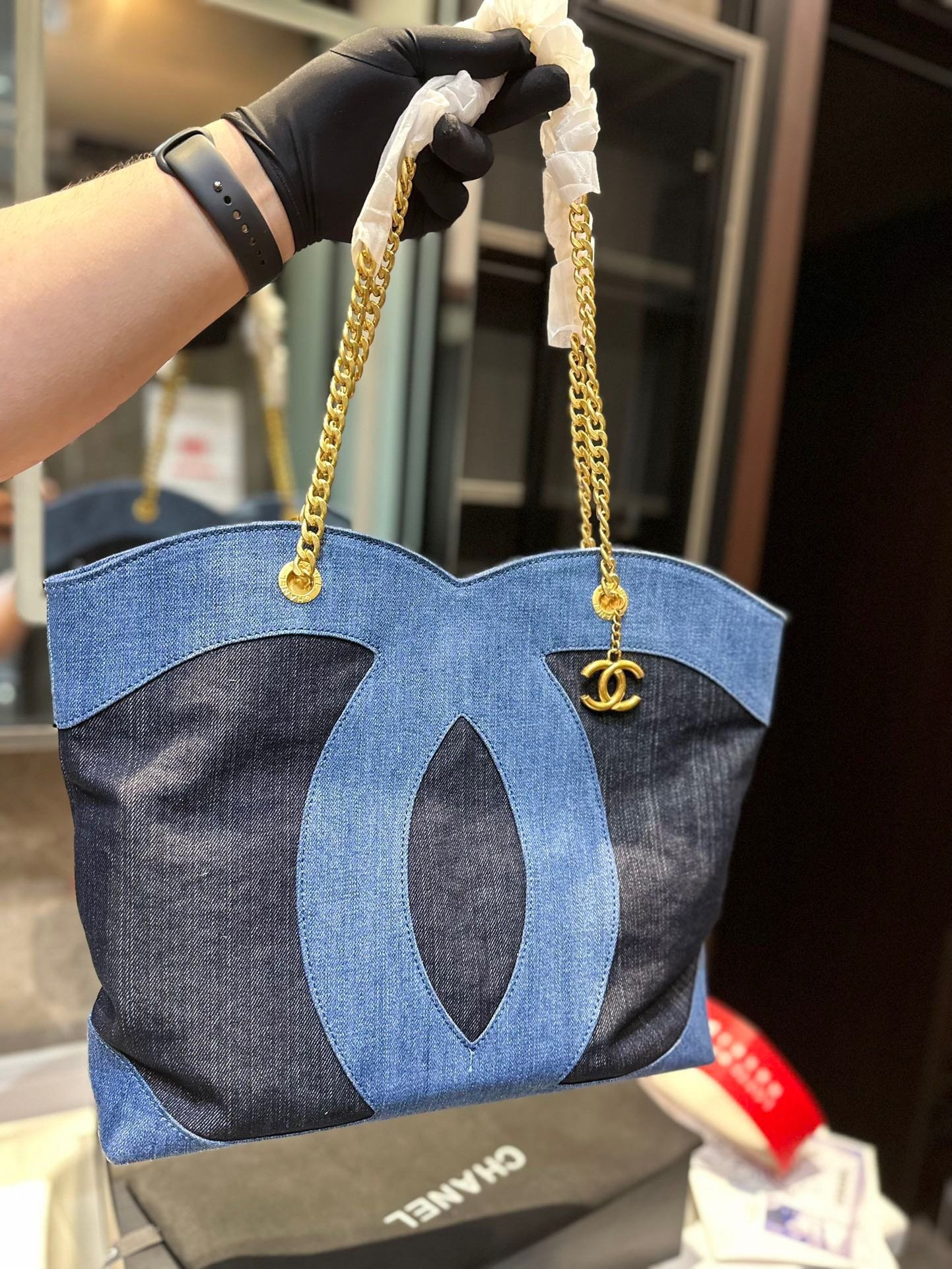 Chanel ramie cotton denim shopping bag beach bag