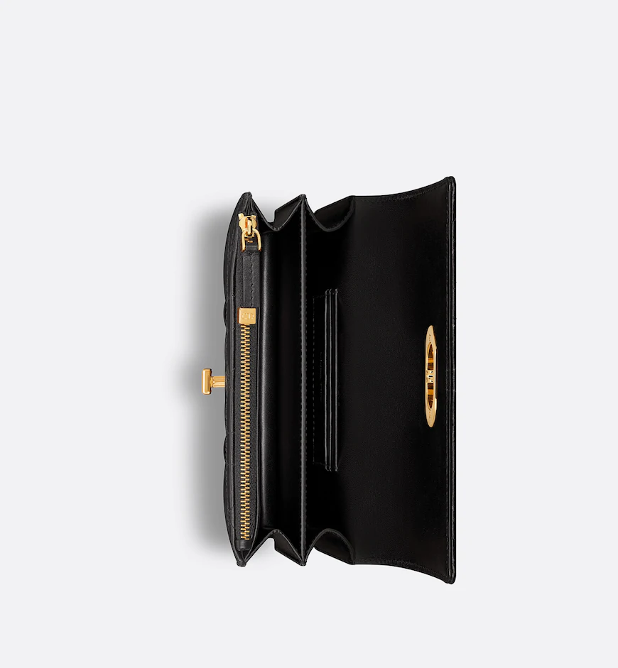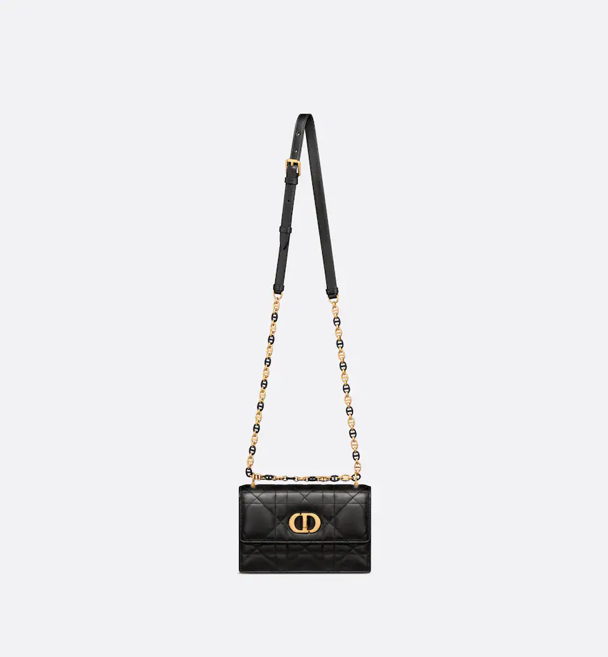 The Miss Caro mini bag enhances the Dior Caro line with modern and timeless elegance. Crafted in black embroidery with a tweed-effect texture, it is embellished with a mix of threads displaying the Cannage motif, as well as a flap accented by a gold-finish metal CD twist clasp inspired by the seal of a Christian Dior perfume bottle. Alternating between gold-finish metal links and tonal enamel links that match the leather, the adjustable chain shoulder strap has a leather insert for added comfort when carrying the bag by hand or wearing it crossbody.