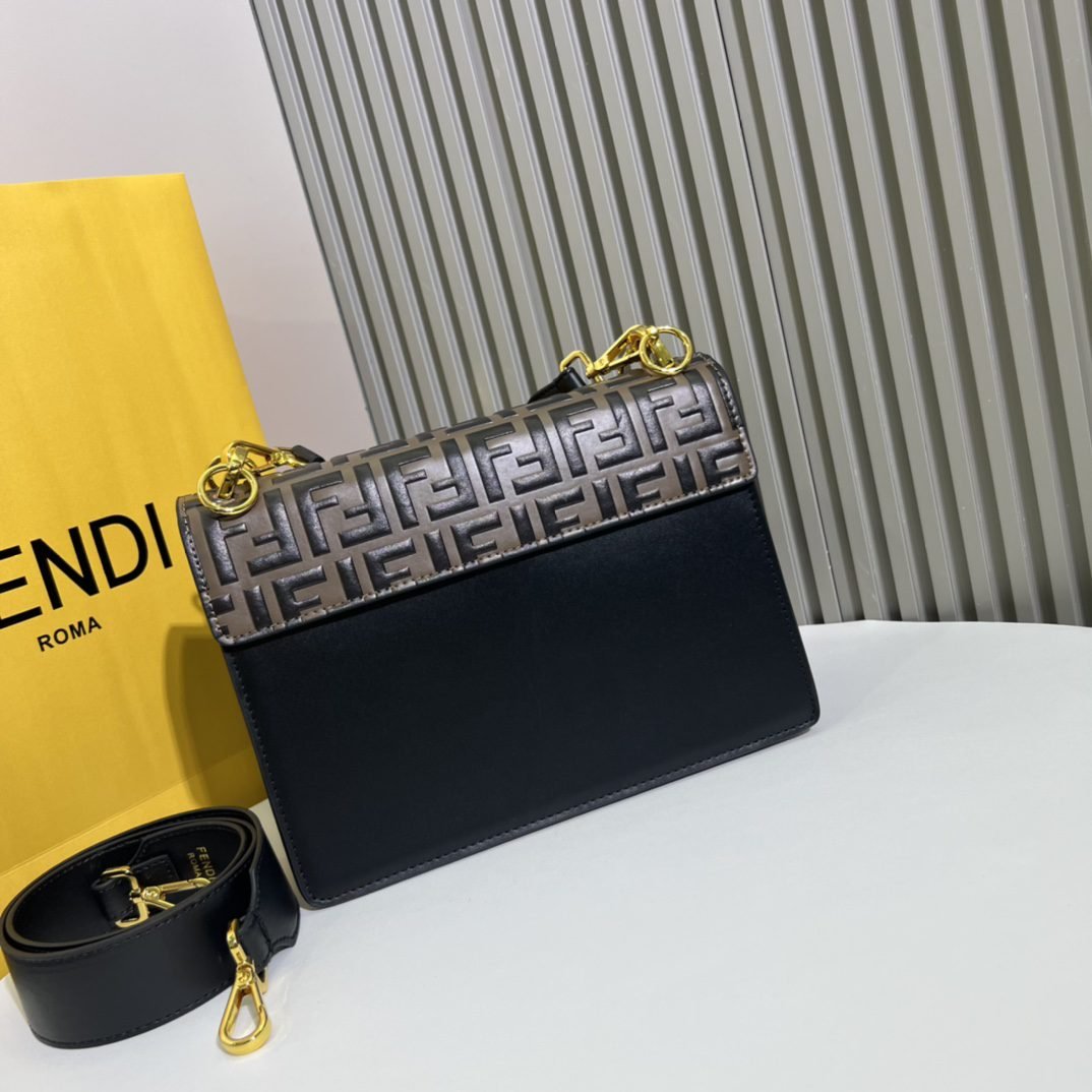 The latest clamshell handbag 👉 decorated with the latest fendi logo 💗. The magnetic buckle opens and closes. Inside pocket. It comes with a detachable shoulder strap and can be held diagonally or in the hand. Imported calfskin 🐂. Fully decorated with hand-painted ff embossed logo. Palladium finish mixed with gold finish Metal accessory 🎀 Model No. 9235 # Size 25.19.11.