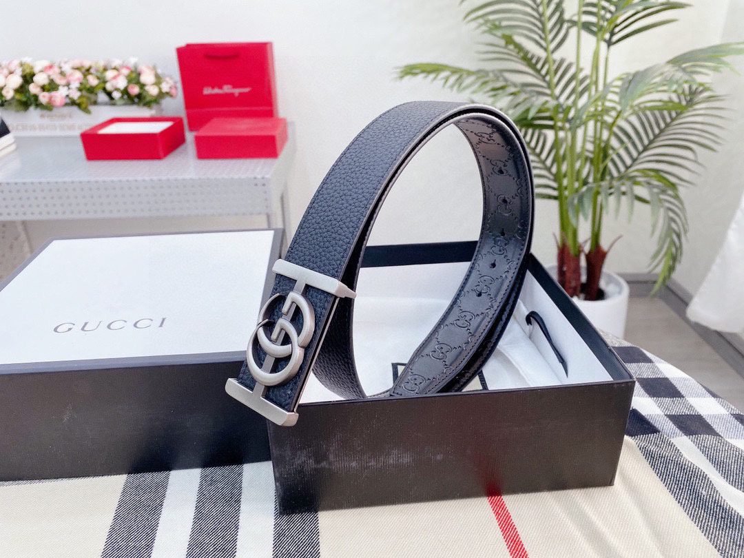 This GUCCI classic double G silver buckle belt, with its unique double G logo and exquisite craftsmanship, demonstrates extraordinary taste and nobility. The belt is made of high-quality leather material, which is soft and delicate to the touch, while having good toughness and durability. The belt can be used on both sides. The silver buckle design is simple and elegant, which contrasts sharply with the black belt, showing the unique charm of the brand.