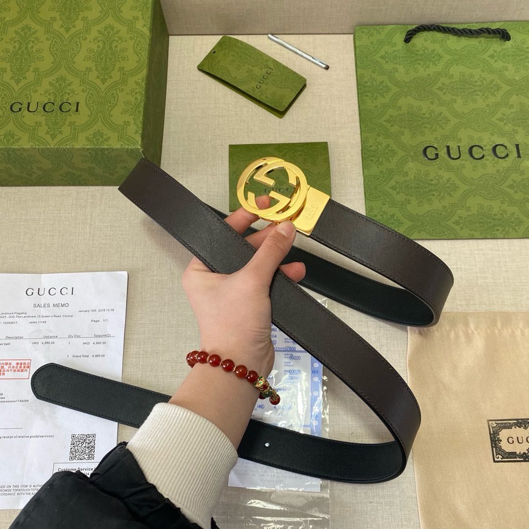 Gucci’s classic black belt shows the brand’s charm with its unique design and exquisite craftsmanship. The belt is made of high-quality black leather, which is soft to the touch and durable, ensuring wearing comfort and durability. The golden buckle is engraved with the eye-catching G letter logo, highlighting the unique identity of the Gucci brand.