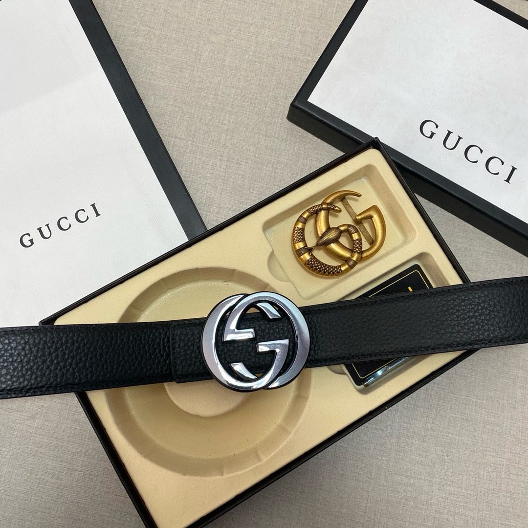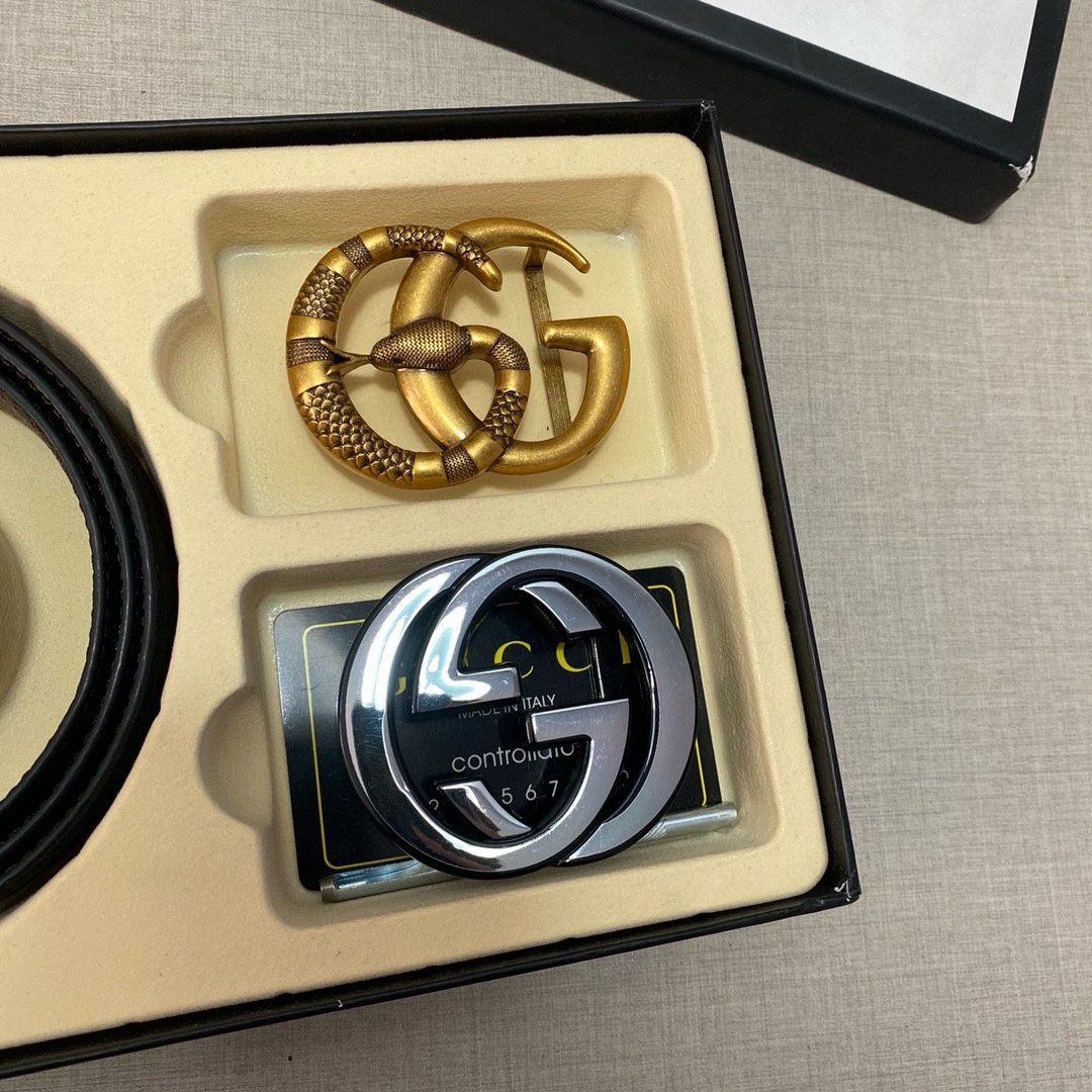 The Gucci double-buckle gift box set combines the brand’s classic and luxury. The gift box contains a selected black leather belt, a shining gold Gucci logo buckle and an exquisite silver double G logo buckle, each of which represents Gucci’s unremitting pursuit of quality and details. The black leather belt is smooth and soft, the gold Gucci logo buckle shines with luxurious light, and the silver buckle reveals a low-key elegance. The three together constitute this tasteful gift box.