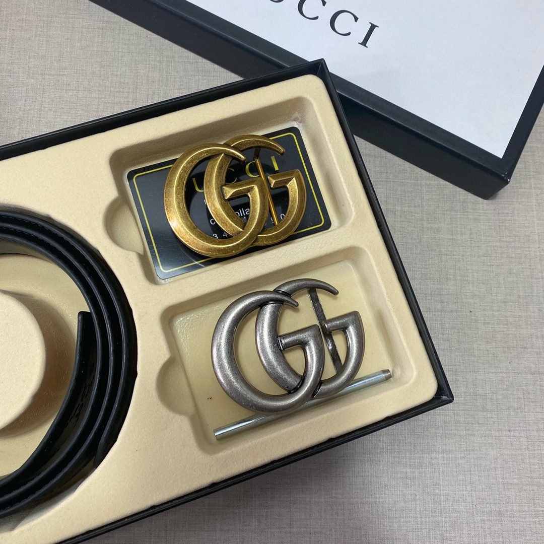 Gucci two-button gift box set combines elegance and luxury. Selected from the finest black leather, it feels delicate and elastic, presenting an unparalleled texture. Pair it with a metal buckle to show your dignity and taste, making you stand out from the crowd. The suit also contains two buckles of different sizes, which can be freely adjusted according to the waistline to meet the dressing needs of different occasions.
