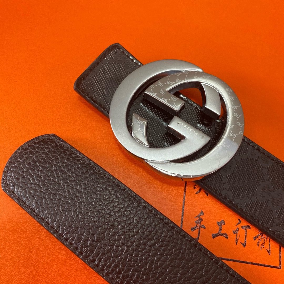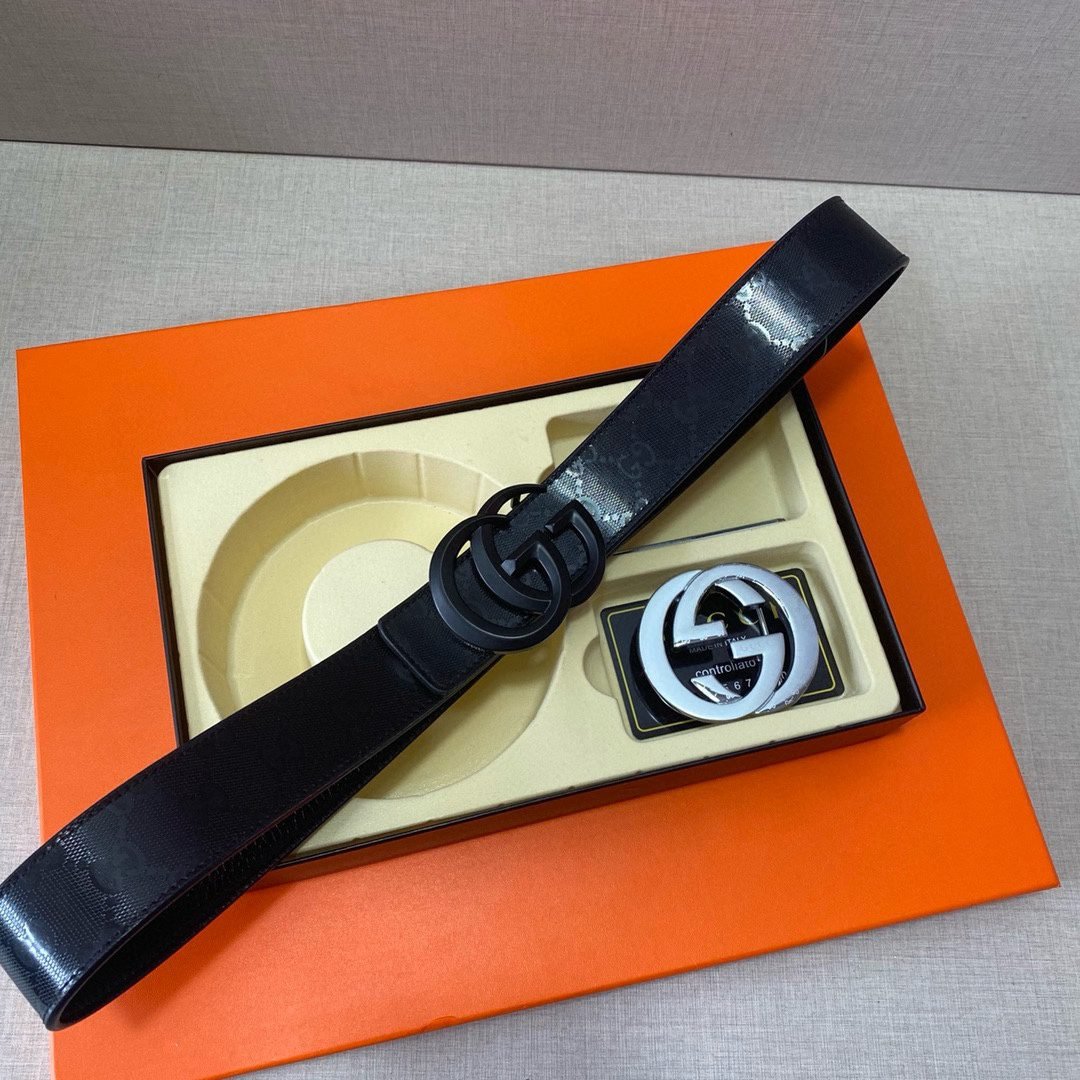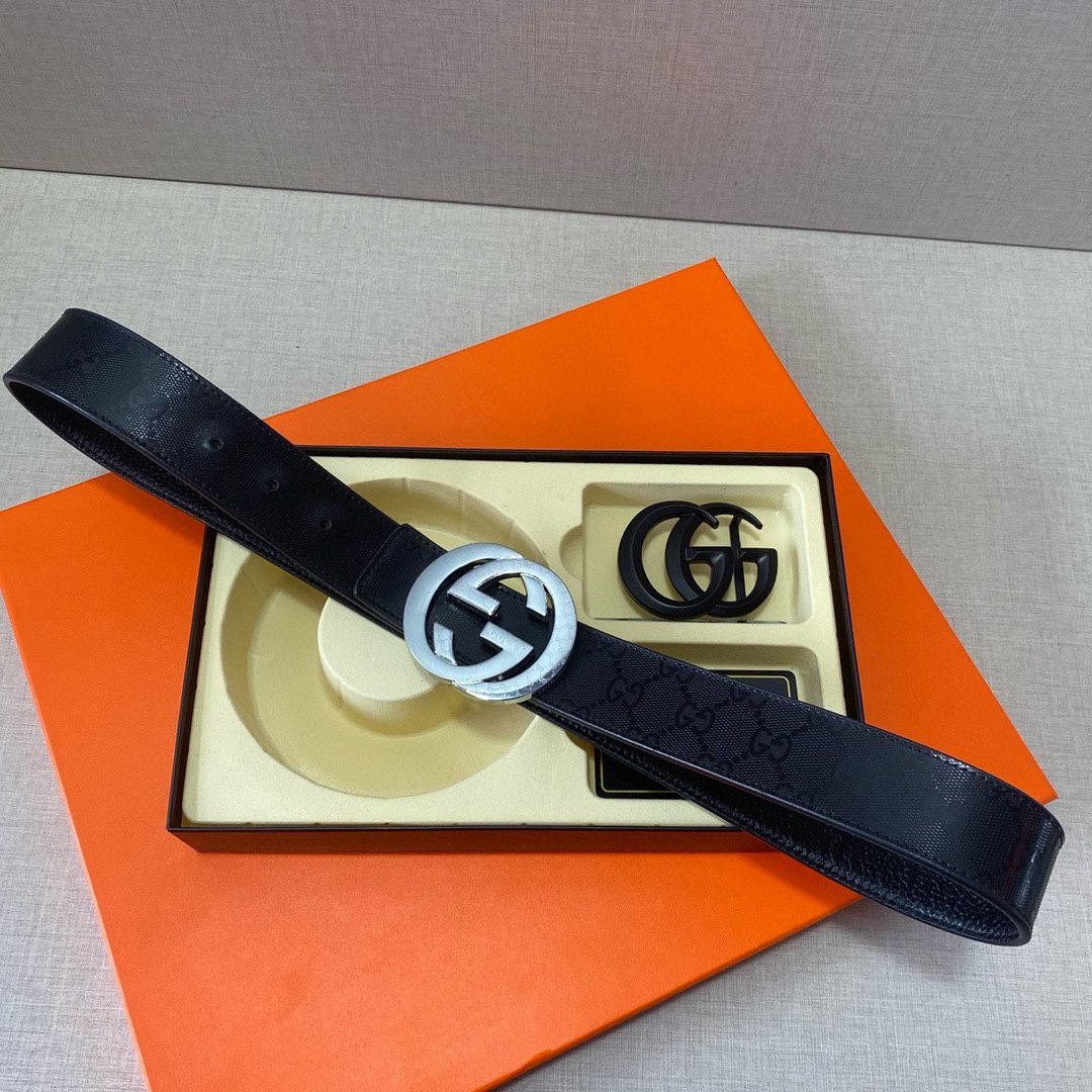 Gucci two-button gift box set combines elegance and luxury. Selected from the finest black leather, it feels delicate and elastic, presenting an unparalleled texture. Pair it with a metal buckle to show your dignity and taste, making you stand out from the crowd. The suit also contains two buckles of different sizes, which can be freely adjusted according to the waistline to meet the dressing needs of different occasions.