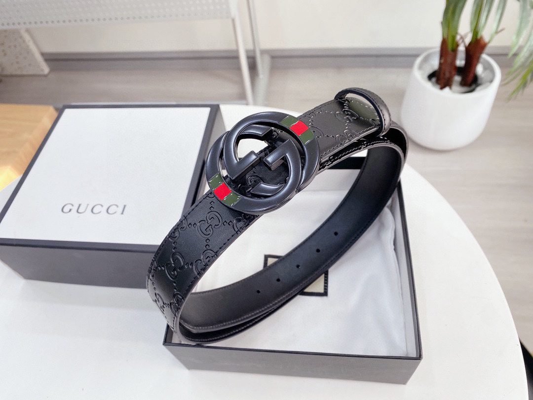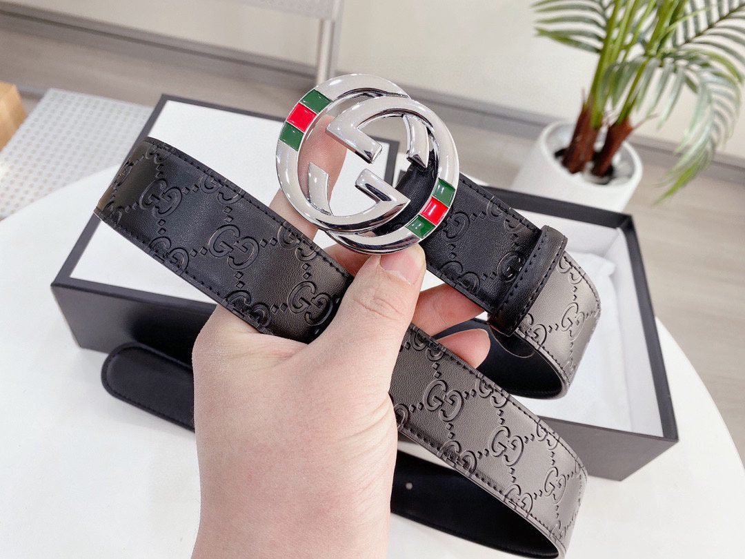 GUCCI G-shaped classic two-color edge belt perfectly combines the brand’s classic elements with modern design. The belt is made of top-grade leather material, which is soft and delicate to the touch, highlighting quality and nobility. The eye-catching “G” logo on the belt buckle is made with exquisite craftsmanship, highlighting the brand’s charm. In particular, the middle of the buckle is inlaid with red and green two-color trim, which adds a touch of fashion and vitality to the overall design, allowing you to become the focus of any occasion.