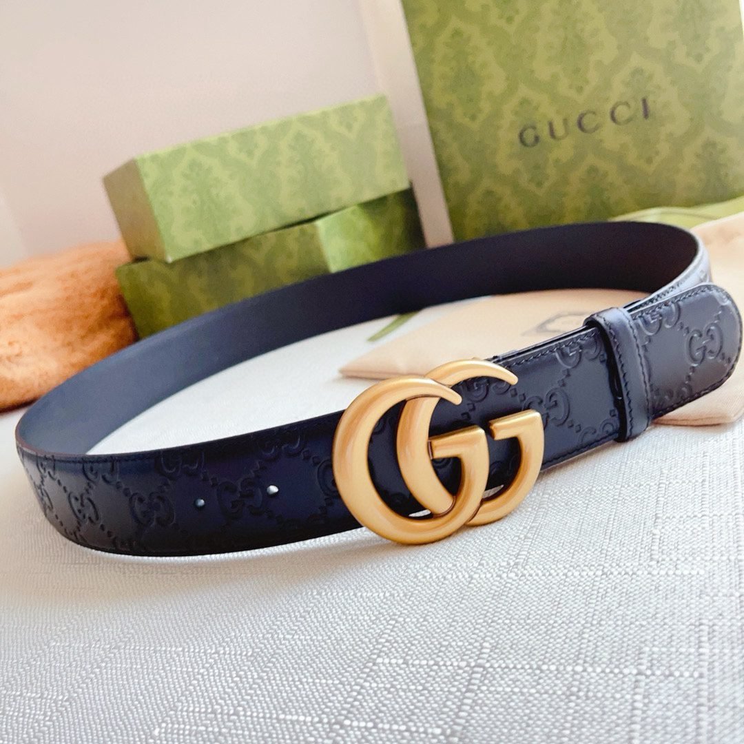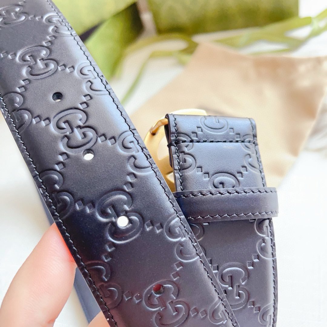 Gucci gold double G buckle black textured belt, showing low-key and luxurious taste. The belt is made of top-grade leather material, which is soft and delicate to the touch and durable. The golden double G buckle design is exquisite, elegant and shining, perfectly integrating the brand’s classic elements with modern fashion sense.