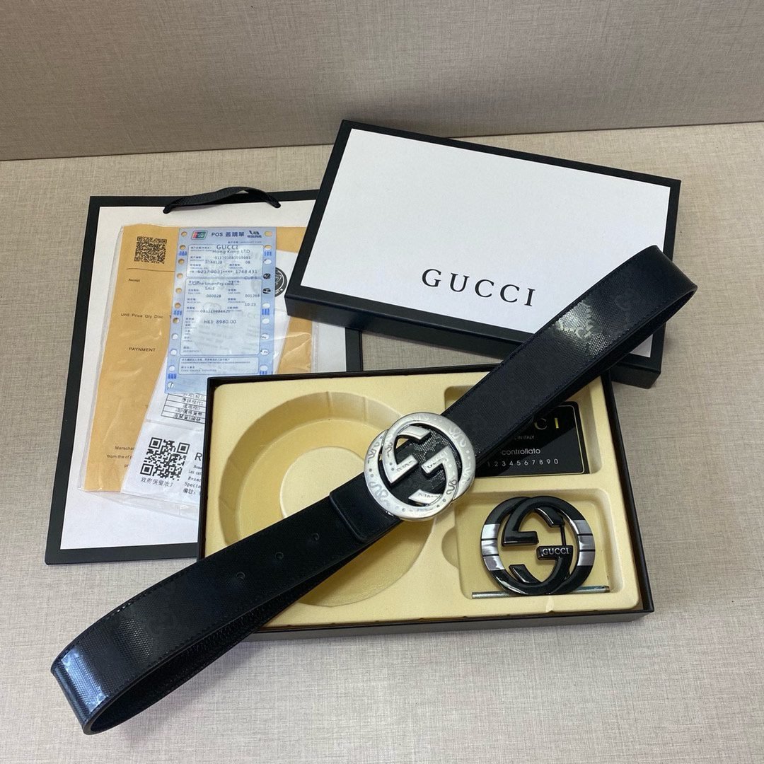 This Gucci classic black textured silver and black G buckle belt is a perfect combination of fashion and quality. The black belt has been carefully textured, making the overall shape more unique and adding a sense of low-key luxury. The silver and black G buckle on the belt is the finishing touch, which not only shows the unique charm of the Gucci brand, but also highlights the personality and taste of the wearer.