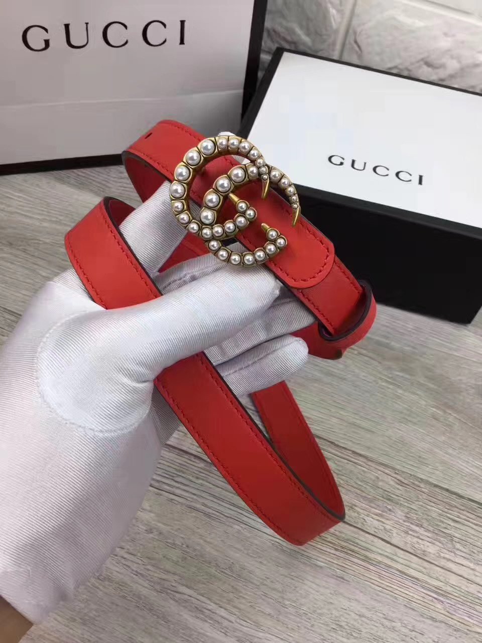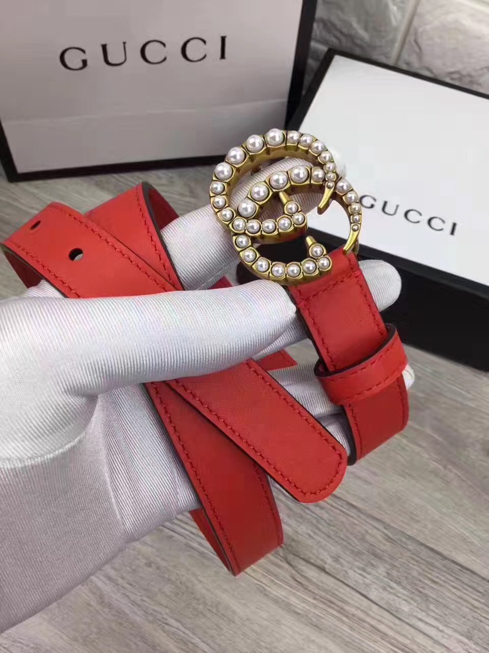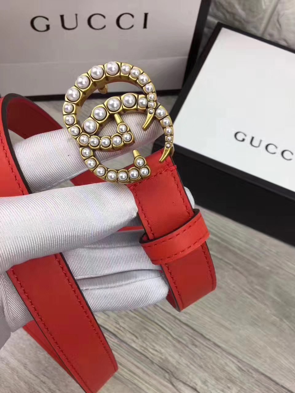 Home Belt GUCCI Belt Gucci Pearl Encrusted Gold Buckle Red Belt Soft to the Touch Extremely Durable Exquisite Pearl Encrusted