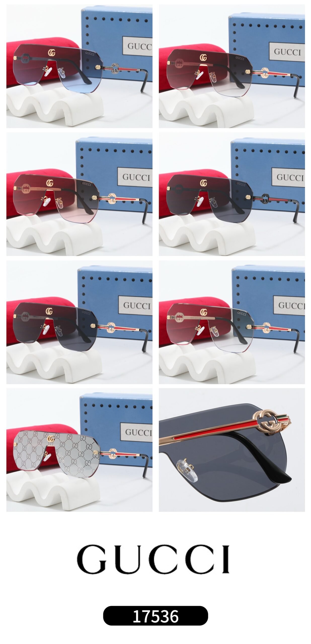 Elevate your fashion taste with the Gucci Rimless Sunglasses Collection. Featuring a stylish rimless design adorned with the iconic golden double – G logo, these sunglasses exude luxury. With a variety of color options, ranging from dark gray and black to gradient burgundy, pink – brown, blue – purple, and light gray, they can meet different styling needs. Not only can they effectively block UV rays and provide excellent sun protection, but they can also instantly add a touch of sophistication to your look. Whether you’re strolling through the urban streets or enjoying a beach vacation, these Gucci sunglasses are the perfect combination of fashion and functionality, making them a must – have item for trend – seekers.