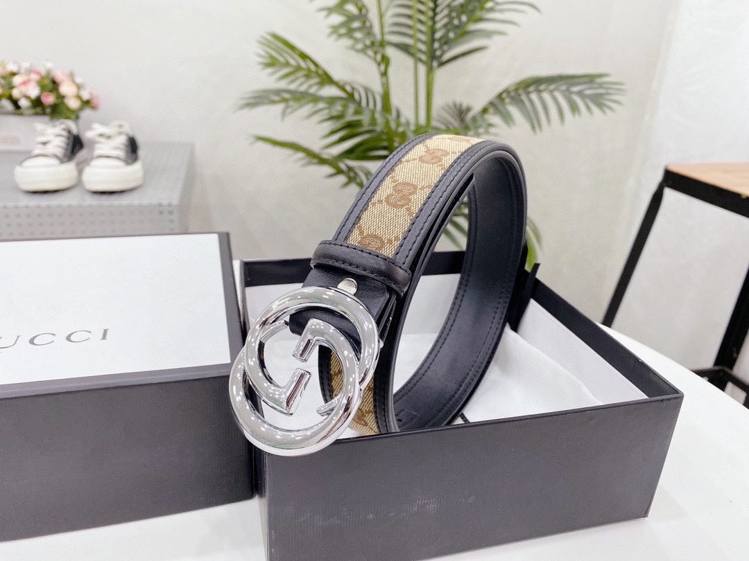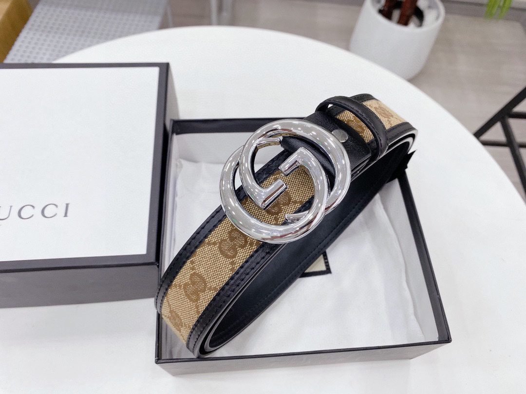 This Gucci silver buckle brown canvas belt shows the brand’s nobility and fashion with its unique design and high-quality materials. The belt is made of brown canvas, which is durable and lightweight, while also giving it a casual yet tasteful feel. The silver buckle design is simple and elegant, forming a sharp contrast with the brown canvas, adding a modern feel. The buckle is engraved with the classic “G” letter logo, highlighting the unique charm of the Gucci brand.