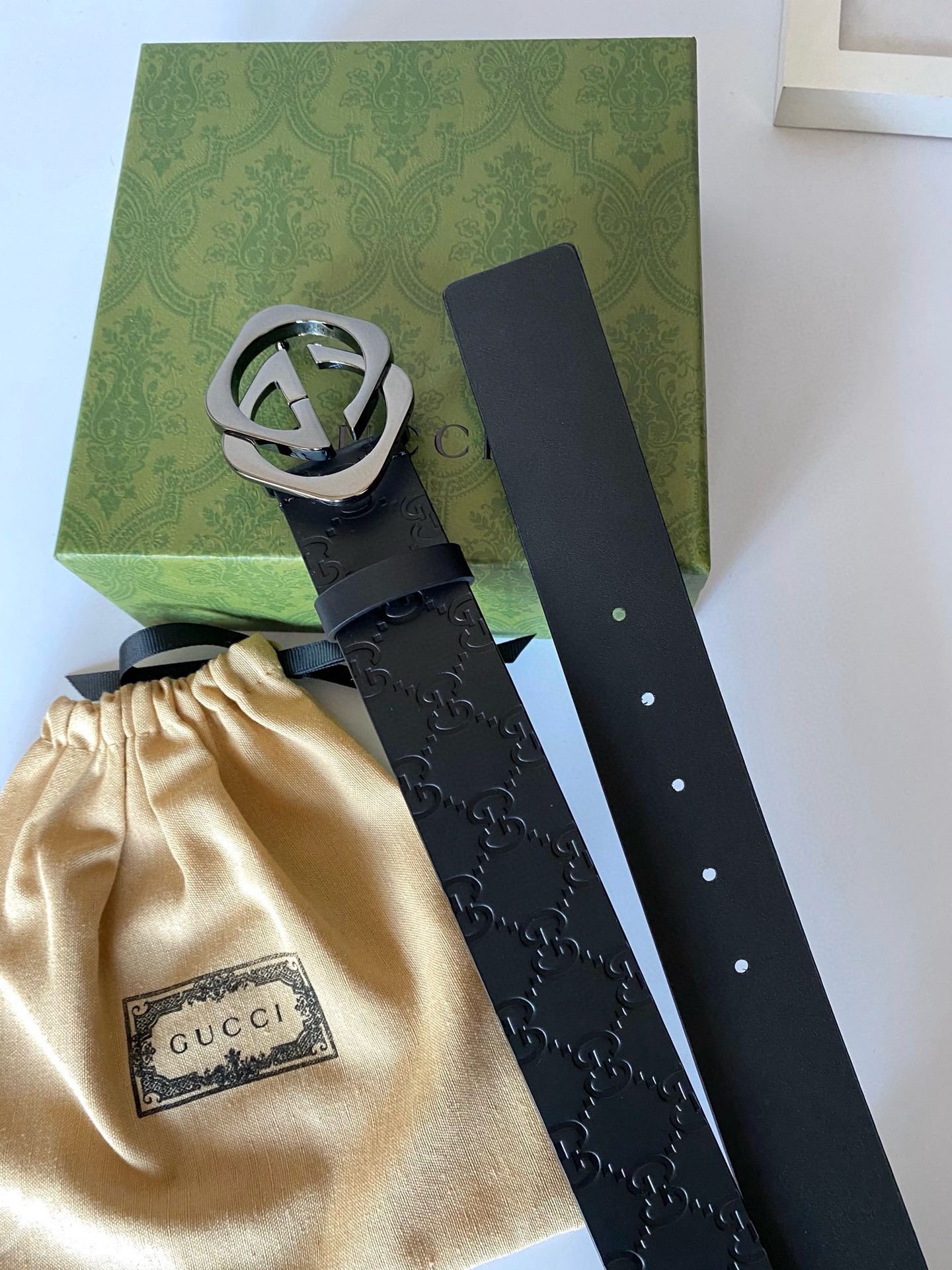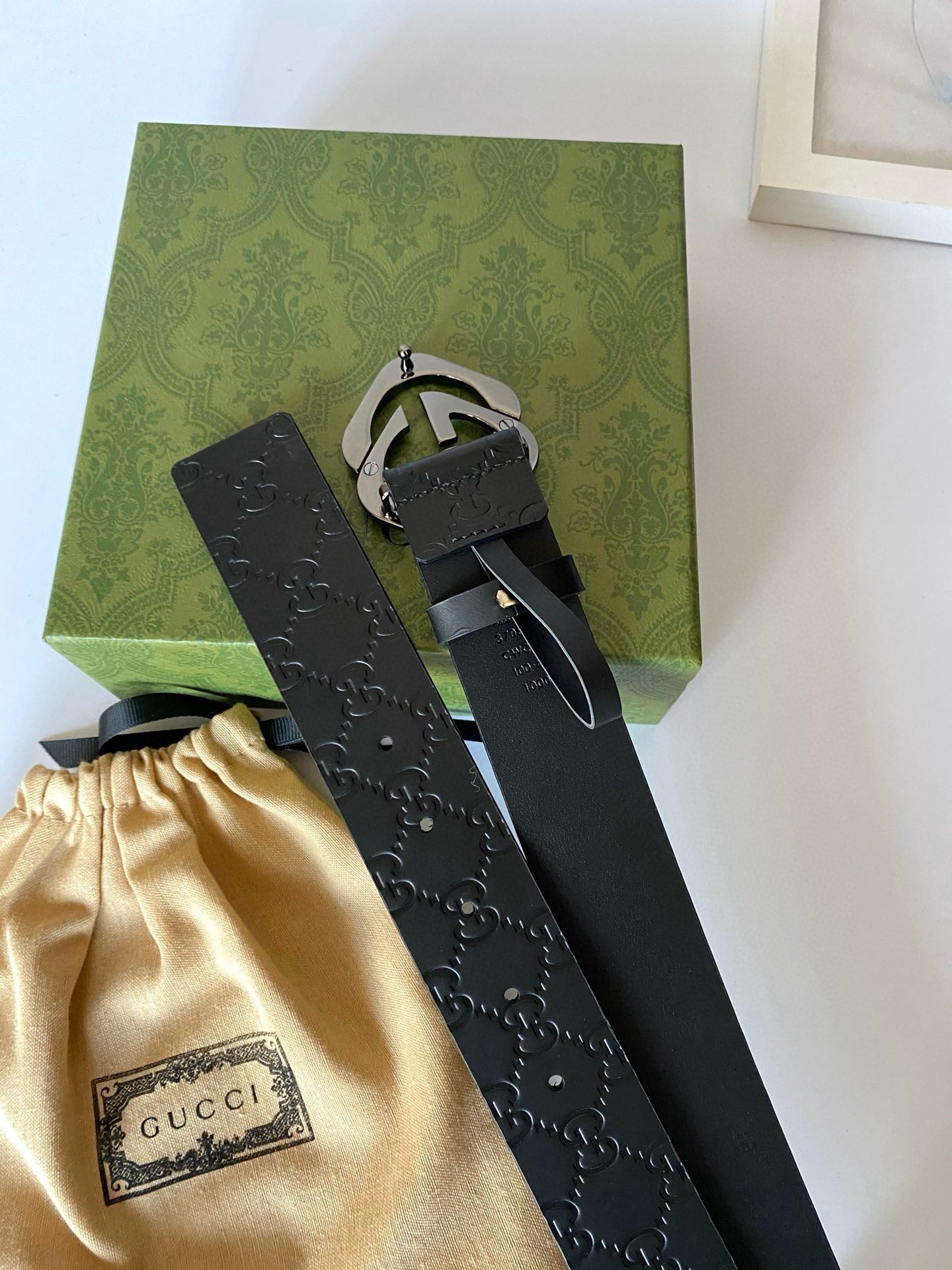 Gucci black double G buckle black textured belt, with its unique G-shaped buckle design, highlights the brand’s nobility and elegance. The belt is made of high-quality black leather, which is soft and delicate to the touch while being wear-resistant and durable. The G-shaped buckle is made of fine steel, and its surface has been polished to give it a bright luster, showing its luxurious quality. In addition, the length of the belt can be flexibly adjusted according to personal waist circumference to ensure wearing comfort.