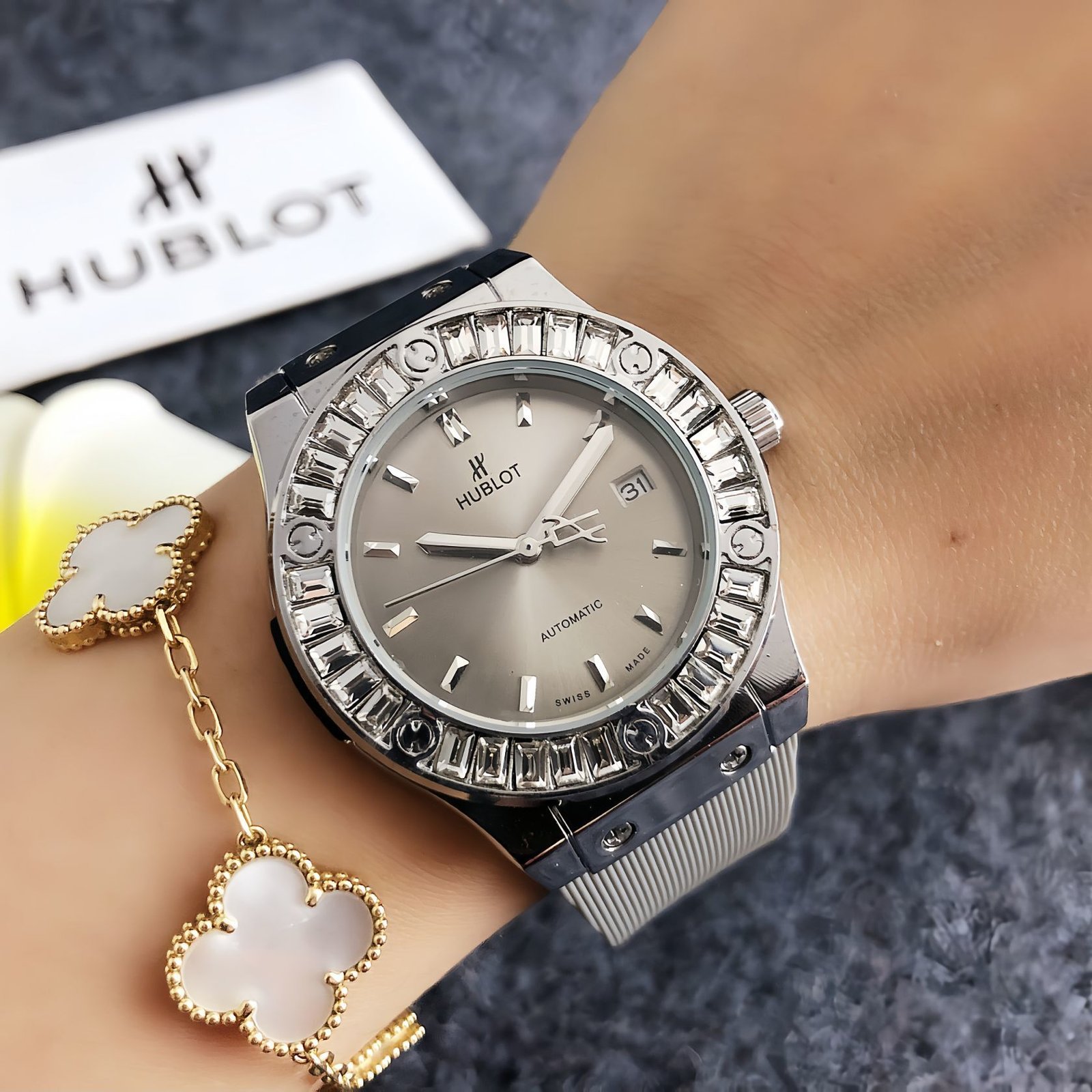 Hublot 841S series watches embody avant-garde luxury, featuring bold cases with crystal-encrusted bezels, vibrant rubber straps in shades like white, gray, red, green, blue, brown, and charcoal, and the brand’s signature technical detailing. With Hublot’s legacy of innovative design and opulent craftsmanship, these timepieces exude dynamic sophistication. Perfect for those who appreciate a blend of high-octane style and colorful versatility, they make a striking statement suitable for both special occasions and bold daily ensembles.