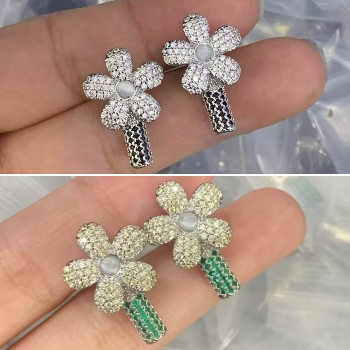 Indulge in the luxury of Louis Vuitton’s iconic blossom earrings, a masterpiece from the brand’s fine jewelry collection. Inspired by the house’s heritage monogram flower, these studs feature a five-petal floral design pavé-set with shimmering diamonds, centered with lustrous pearls. Available in two striking variations — one with silver-tone diamond pavé and black enamel detailing, the other with champagne diamonds and emerald-green gemstone accents — each pair embodies LV’s blend of timeless elegance and avant-garde artistry.