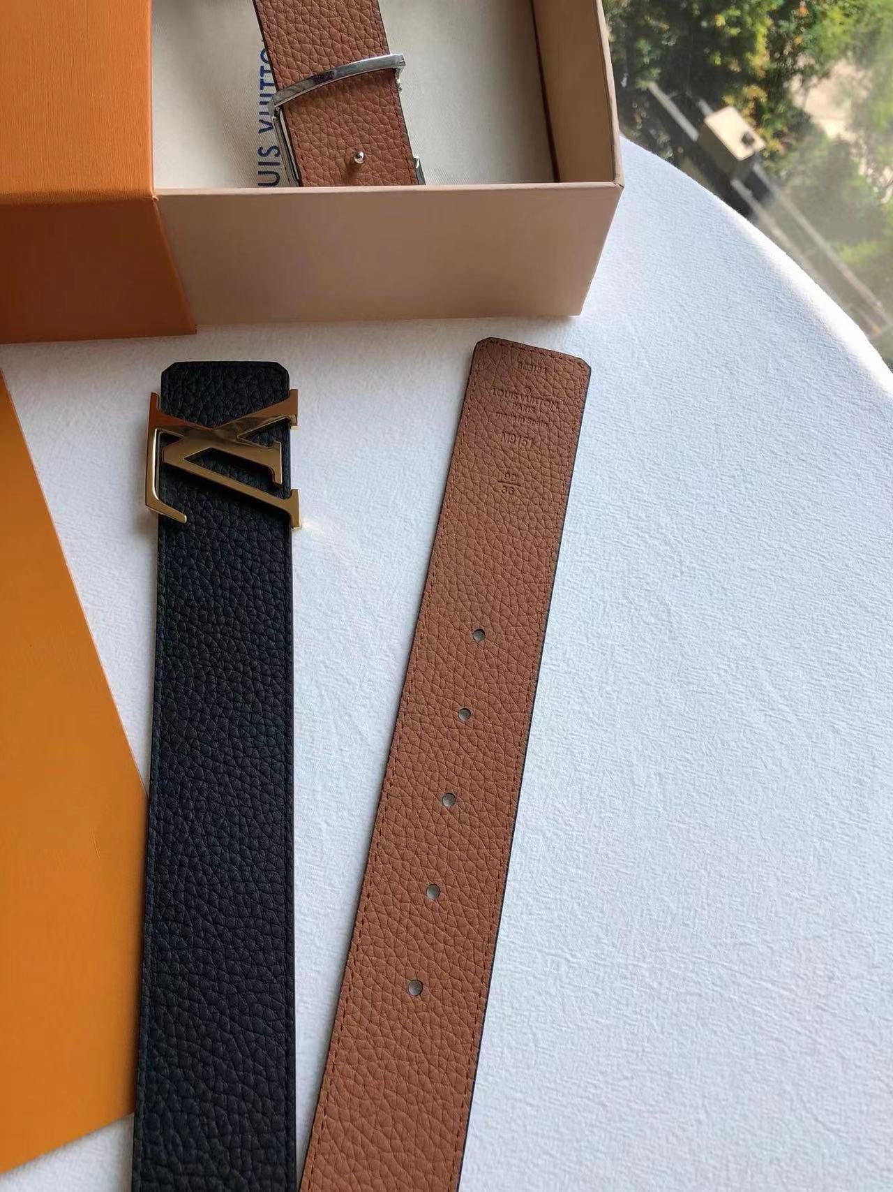 This LOUIS VUITTON gold V buckle black belt, with its unique gold “V” shaped buckle design and black high-quality leather material, demonstrates extraordinary taste and nobility. The golden buckle contrasts sharply with the black leather, like the brightest star in the night sky, shining with a low-key and luxurious light. Every detail has been carefully polished, showing the ultimate craftsmanship.