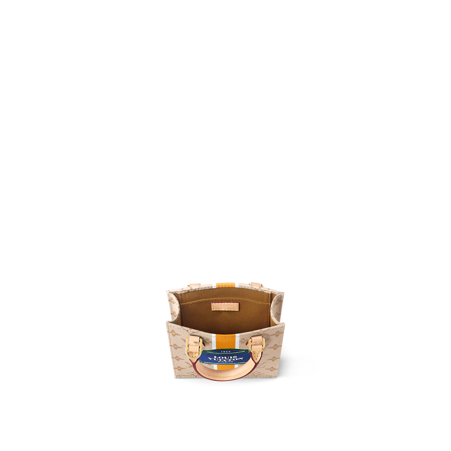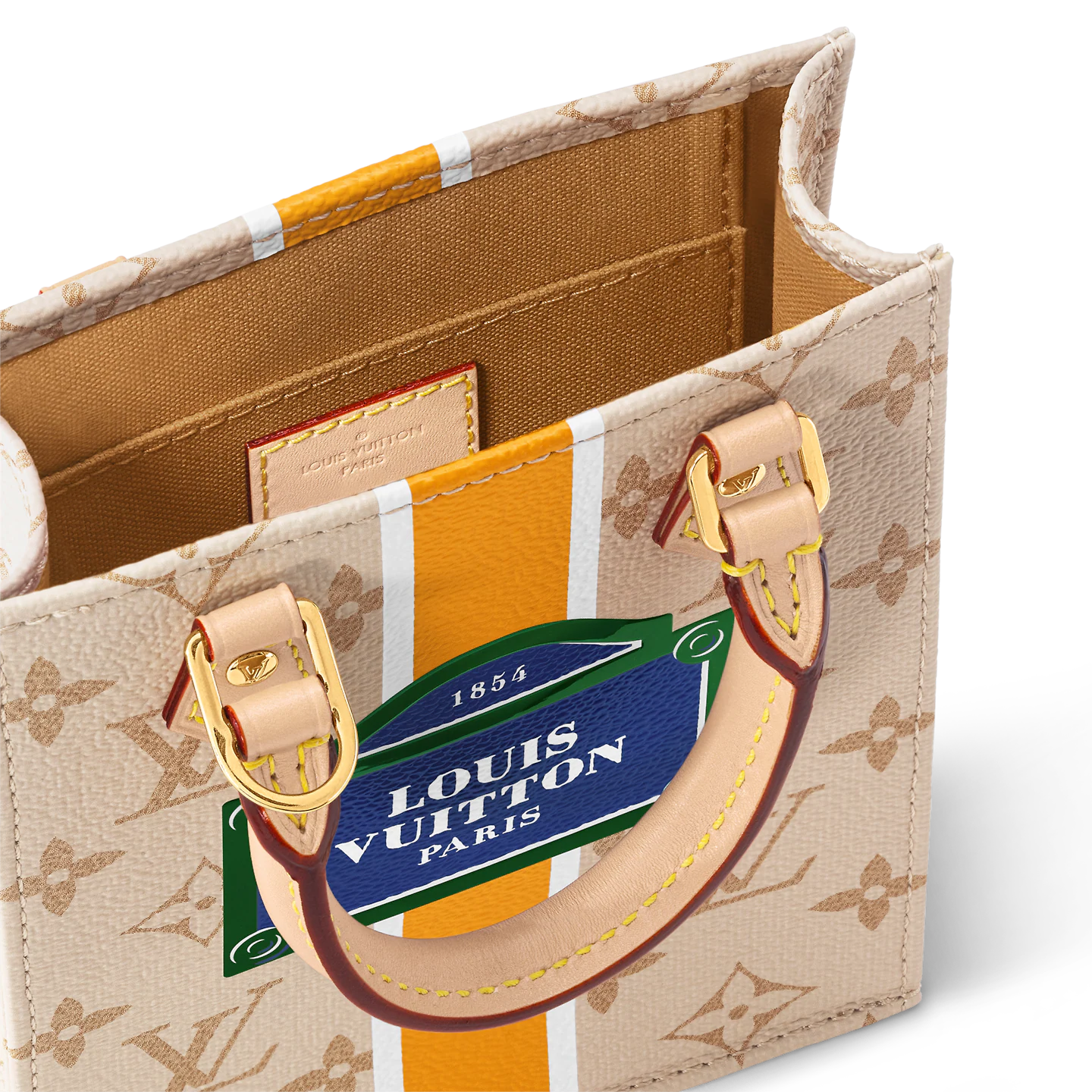 Made from beige Monogram canvas with a textile-like printed effect, the Petit Sac Plat is decorated with a vertical white-and-ocher stripe. In the center of the bag is what looks like a typical Parisian street-sign, featuring the words “Louis Vuitton Paris.” In addition to the two rolled-leather top handles, there’s a removable and adjustable strap.
