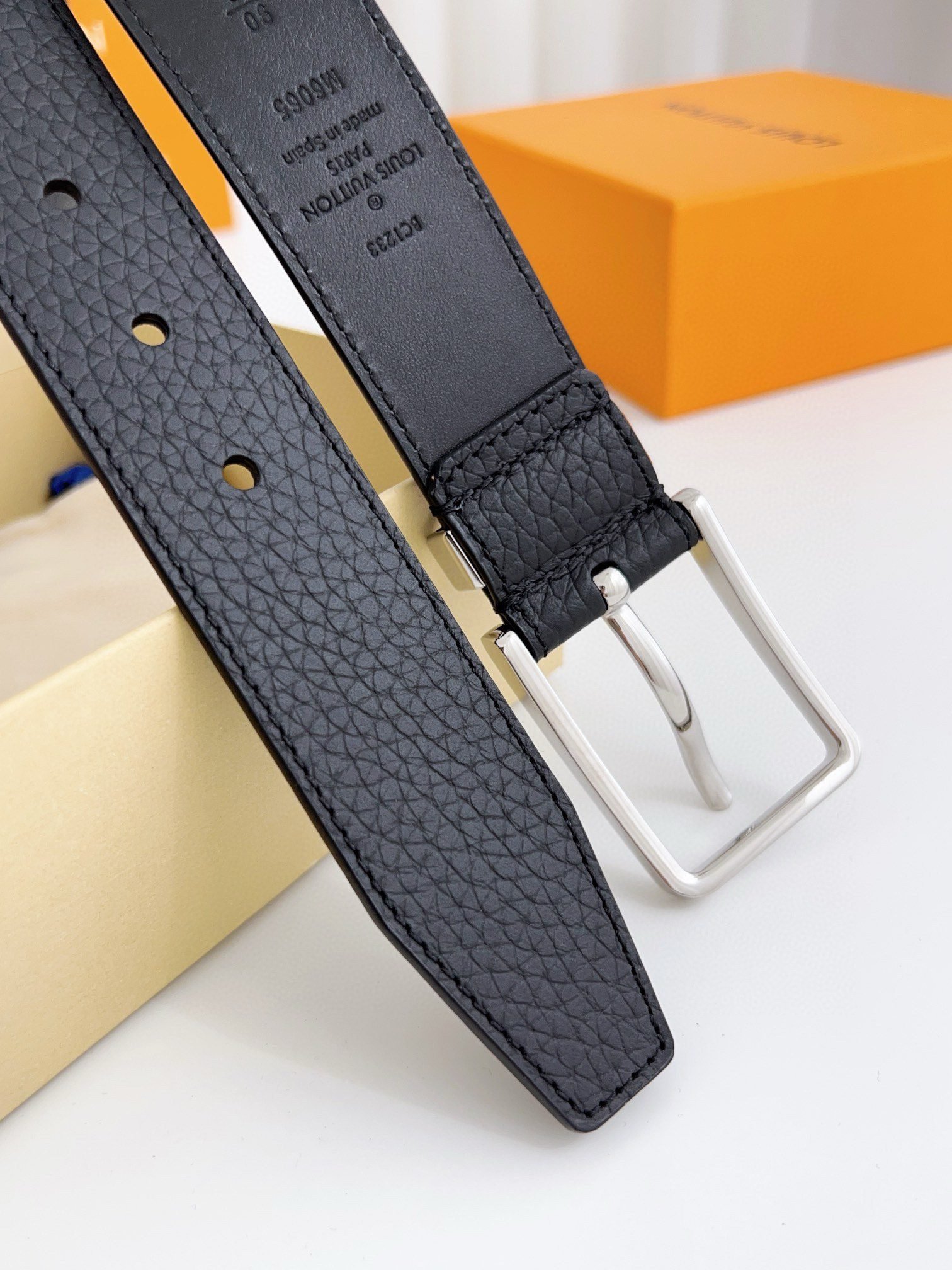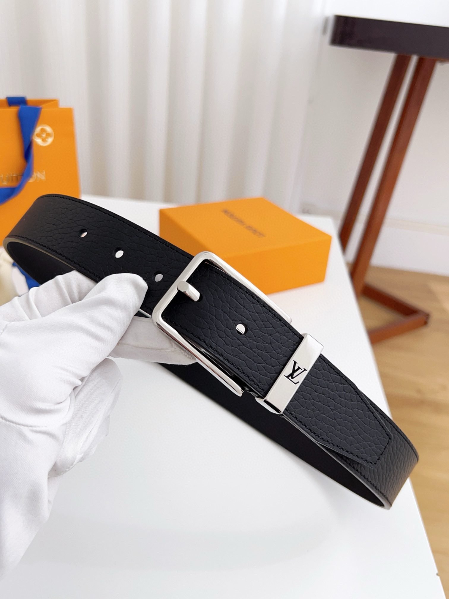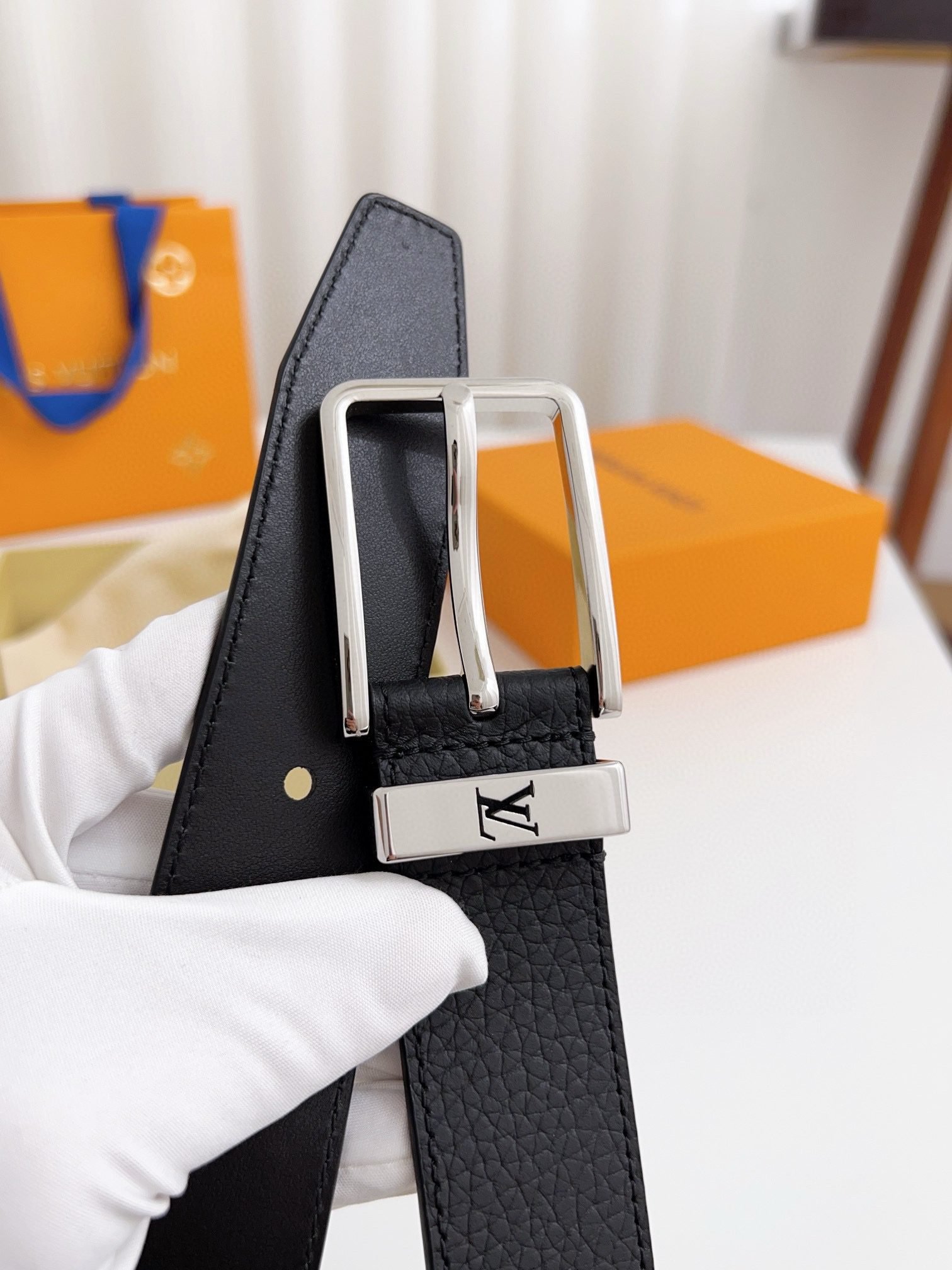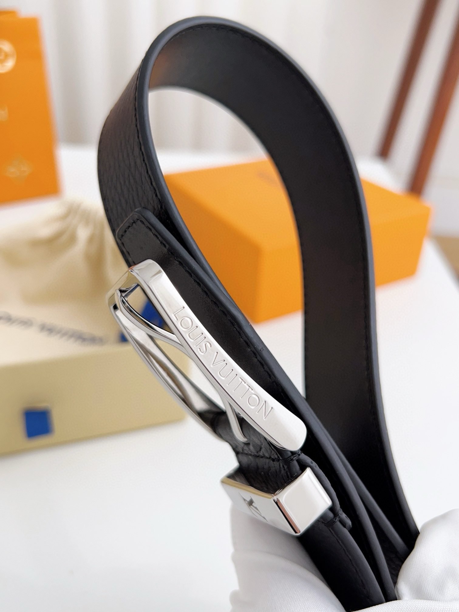 Louis Vuitton silver square buckle black belt, simple and elegant, low-key luxury