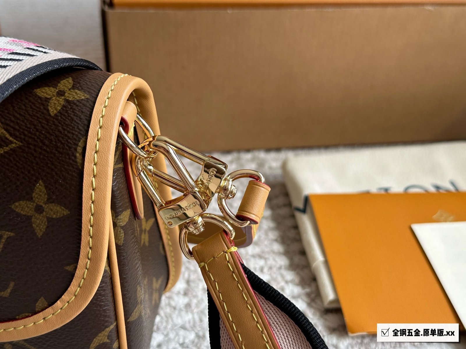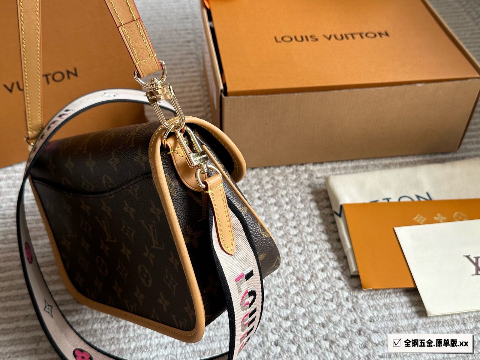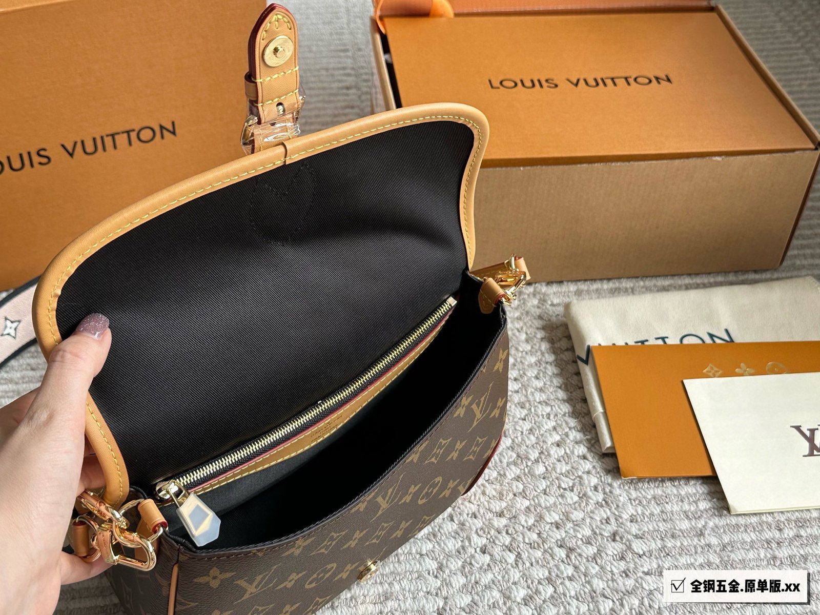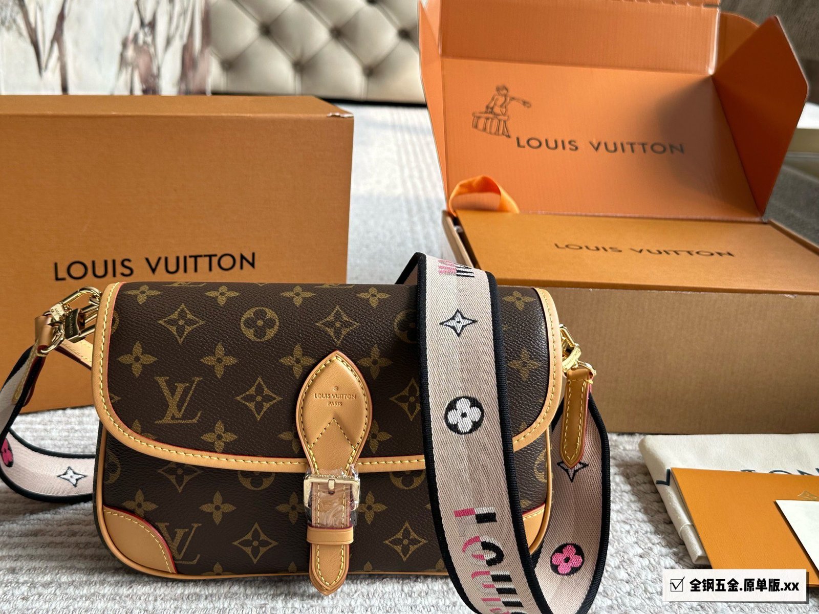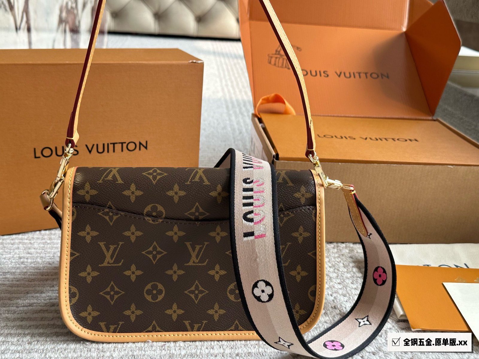 ✨ The iconic LV Diane messenger bag features the signature Monogram canvas paired with natural leather trim. The vintage flap and metal clasp design evokes French elegance, and it comes with two interchangeable straps: a classic leather strap and a printed wide strap, allowing for both shoulder and crossbody wear.