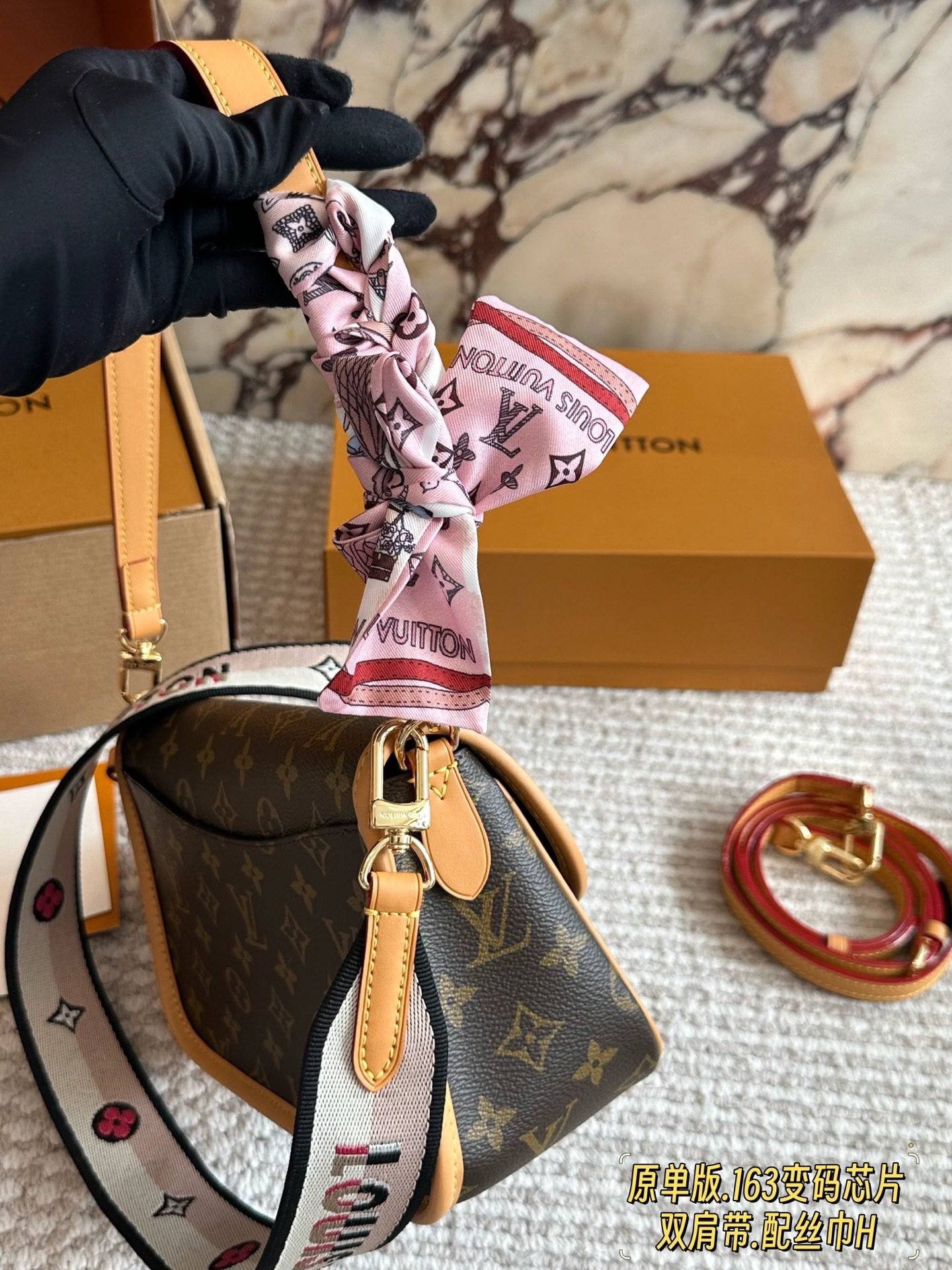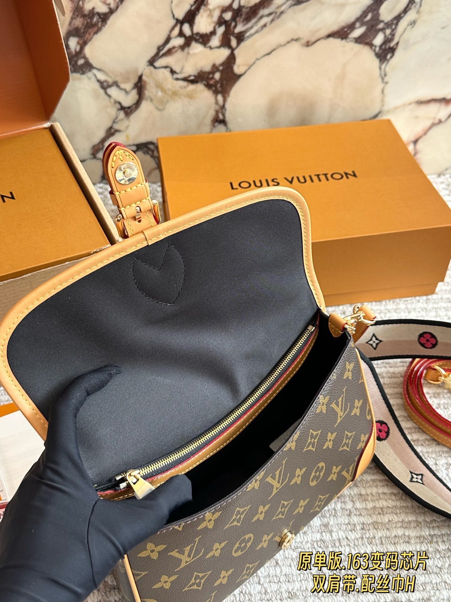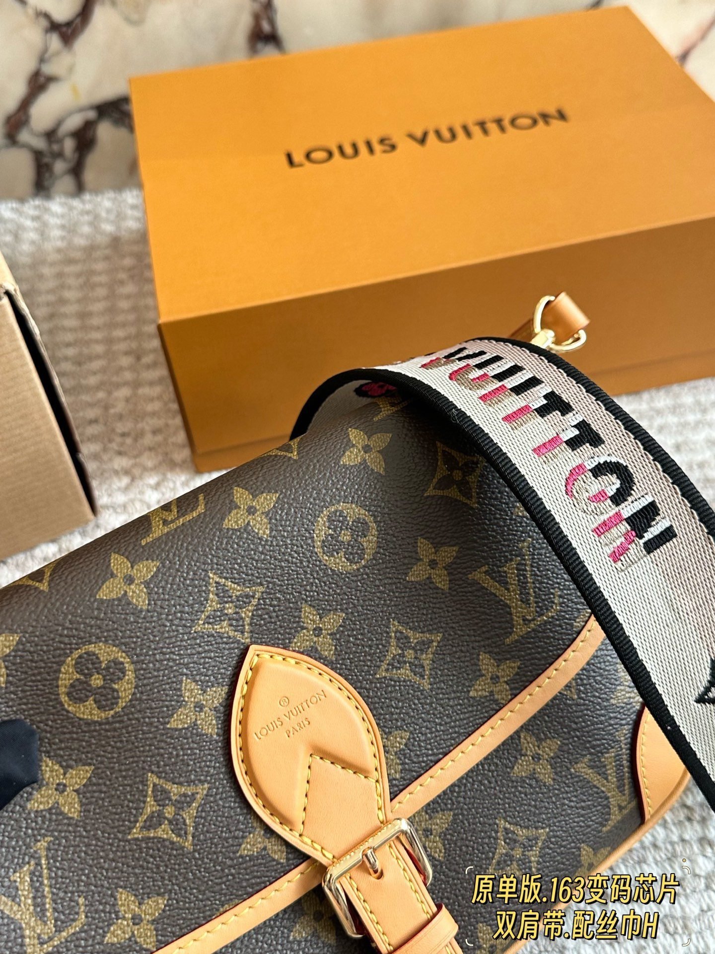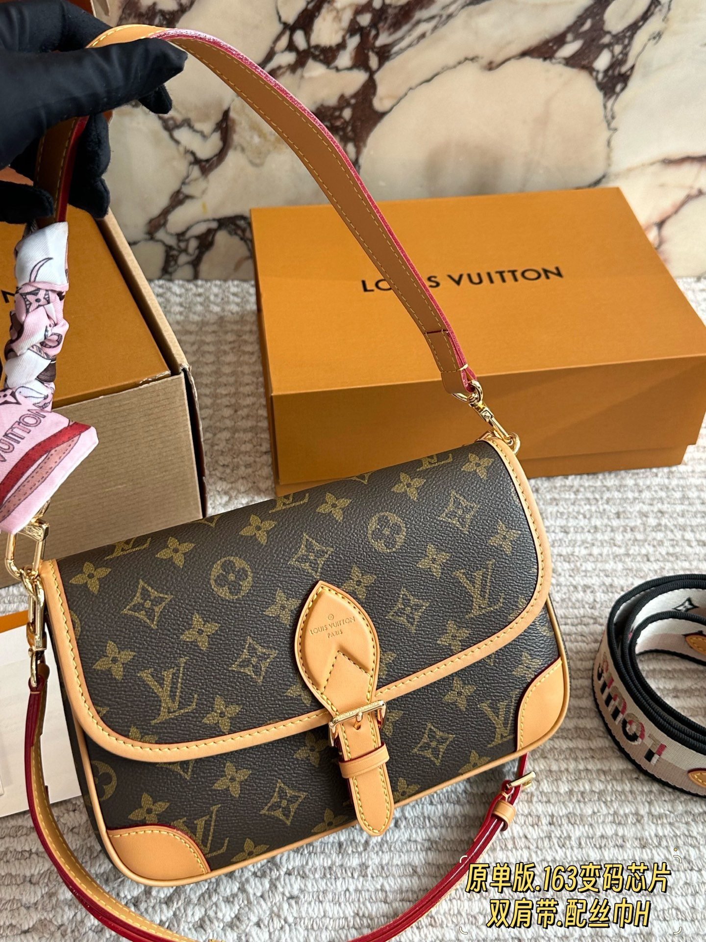 ✨ The iconic LV Diane messenger bag features the signature Monogram canvas paired with natural leather trim. The vintage flap and metal clasp design evokes French elegance, and it comes with two interchangeable straps: a classic leather strap and a printed wide strap, plus a matching silk scarf, allowing you to switch between shoulder and crossbody styles effortlessly for a more dynamic look.