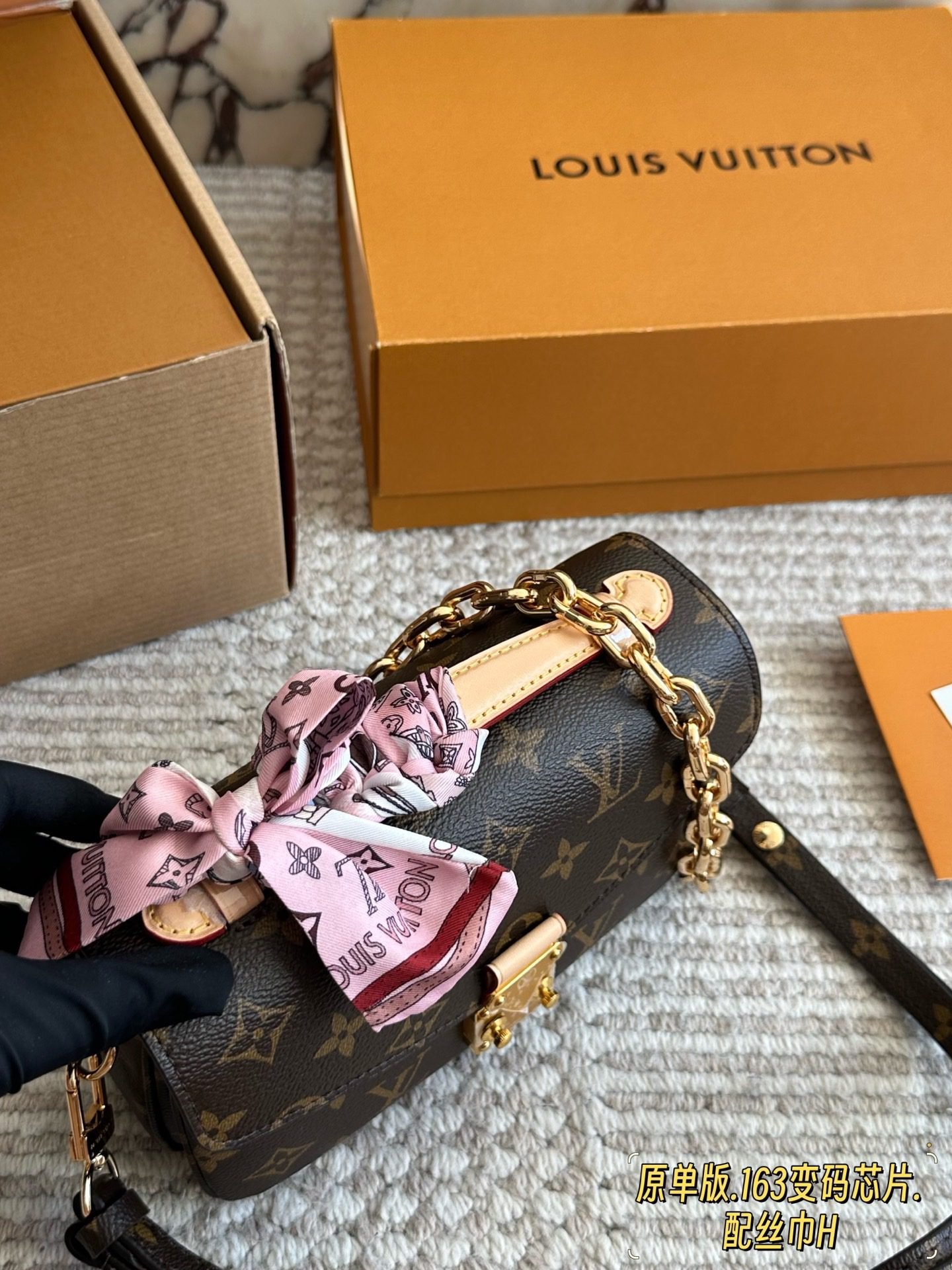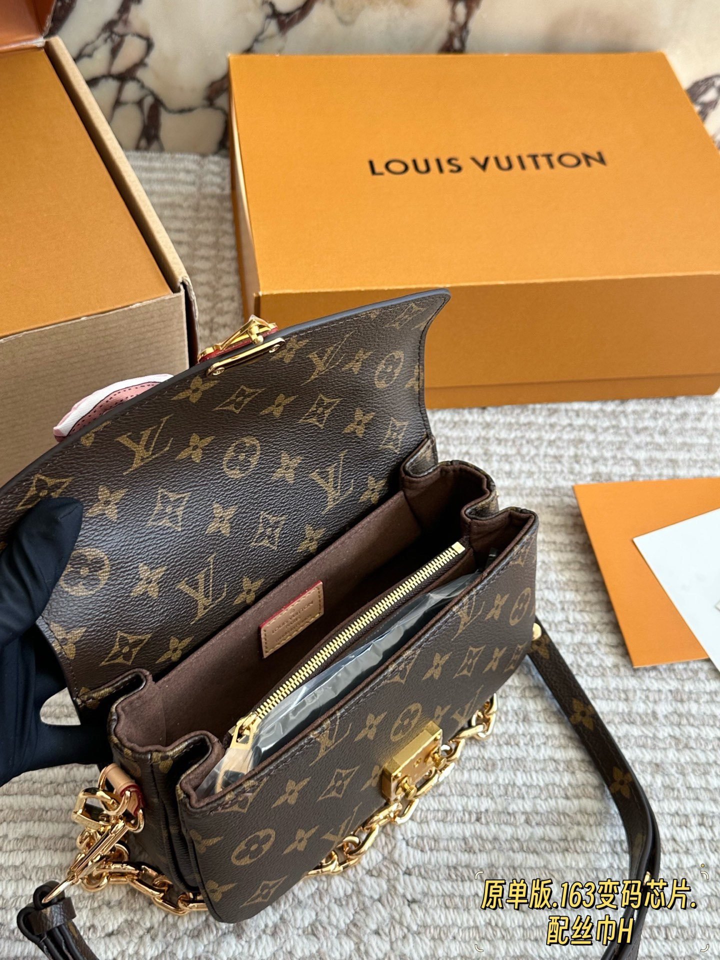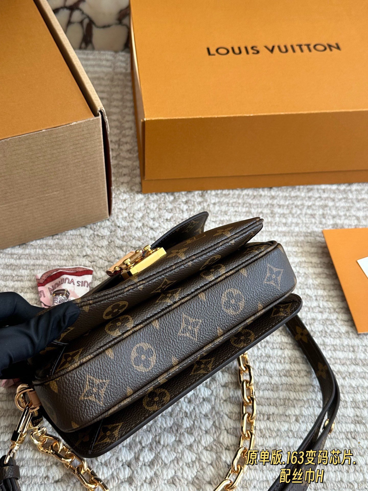 ✨ The iconic LV Pochette Métis messenger bag features the signature Monogram canvas paired with natural leather trim. The distinctive metal lock and chunky chain shoulder strap exude vintage elegance. A matching printed silk scarf is included, which can be tied to the handle or used as a decorative accent for a dynamic touch.