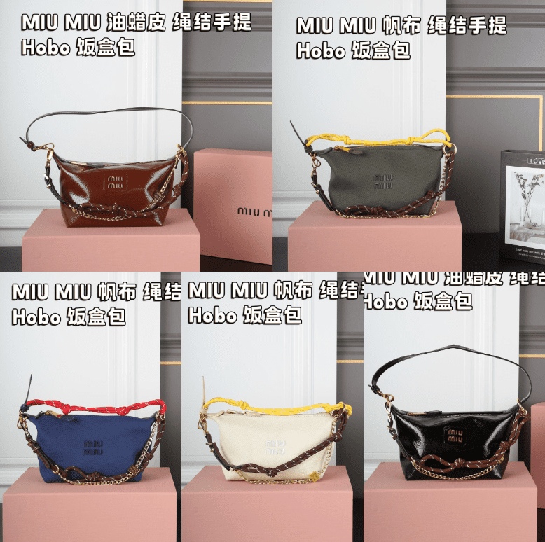 This Miu Miu knot-detail hobo bag collection showcases the brand’s iconic logo and unique knot accents, crafted from materials like waxed leather and canvas with a compact silhouette of 17×12cm. Embodying Miu Miu’s spirit of youthful sophistication and creative design, the bags blend playful details with chic aesthetics. Ideal for those who value distinct branding, meticulous craftsmanship, and a statement piece that infuses any look with whimsical elegance—perfect for elevating everyday styles with undeniable charm and individuality.