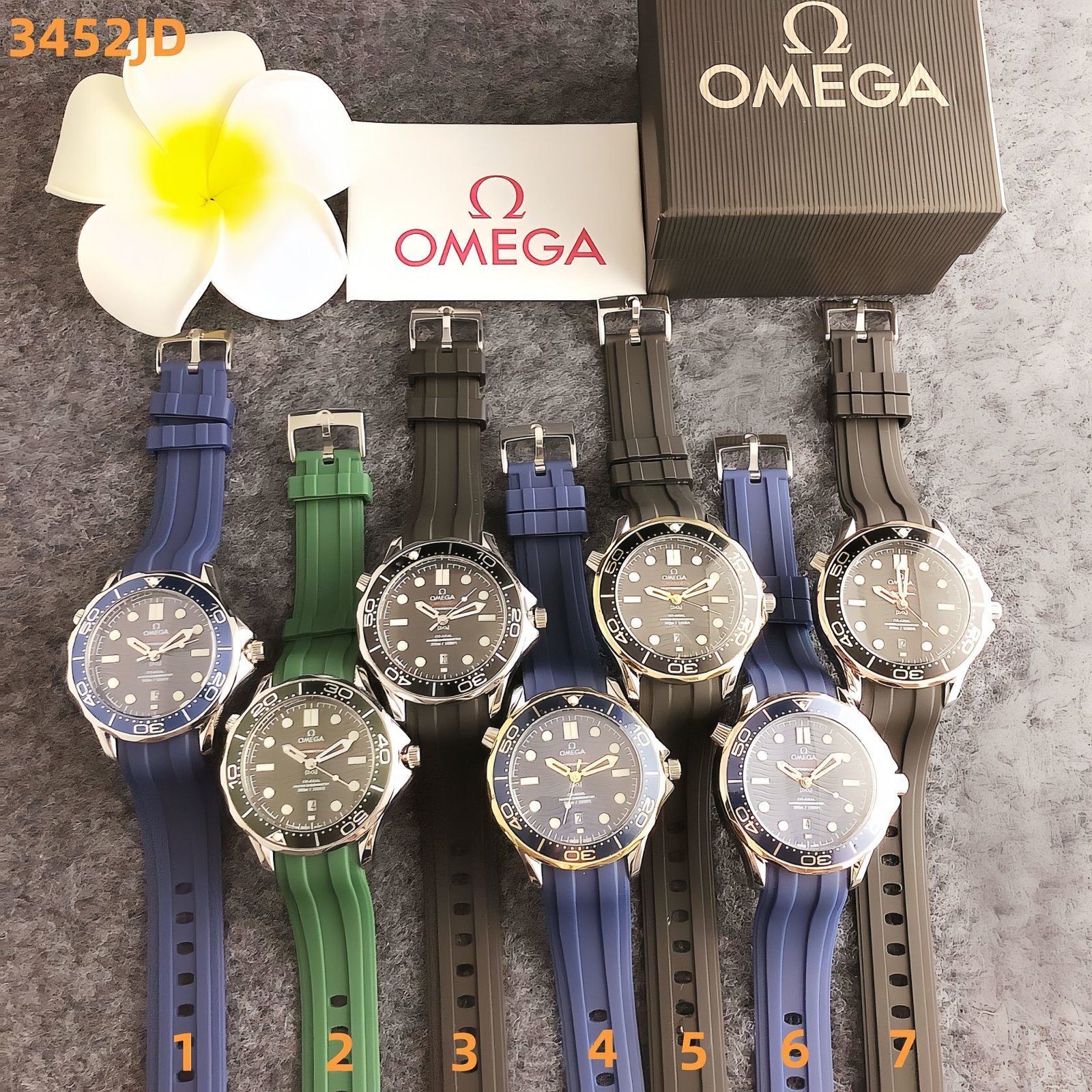 Omega 3452JD series watches embody the brand’s iconic dive-watch heritage with a vibrant modern twist, featuring distinct circular dials, colorful rubber straps in shades like blue, green, and brown, and precise timekeeping functionality. With Omega’s signature attention to detail and legacy of engineering excellence, these timepieces exude rugged yet stylish charm. Perfect for those who appreciate a blend of classic dive style and contemporary color versatility, they make a dynamic statement suitable for both aquatic adventures and everyday urban wear.