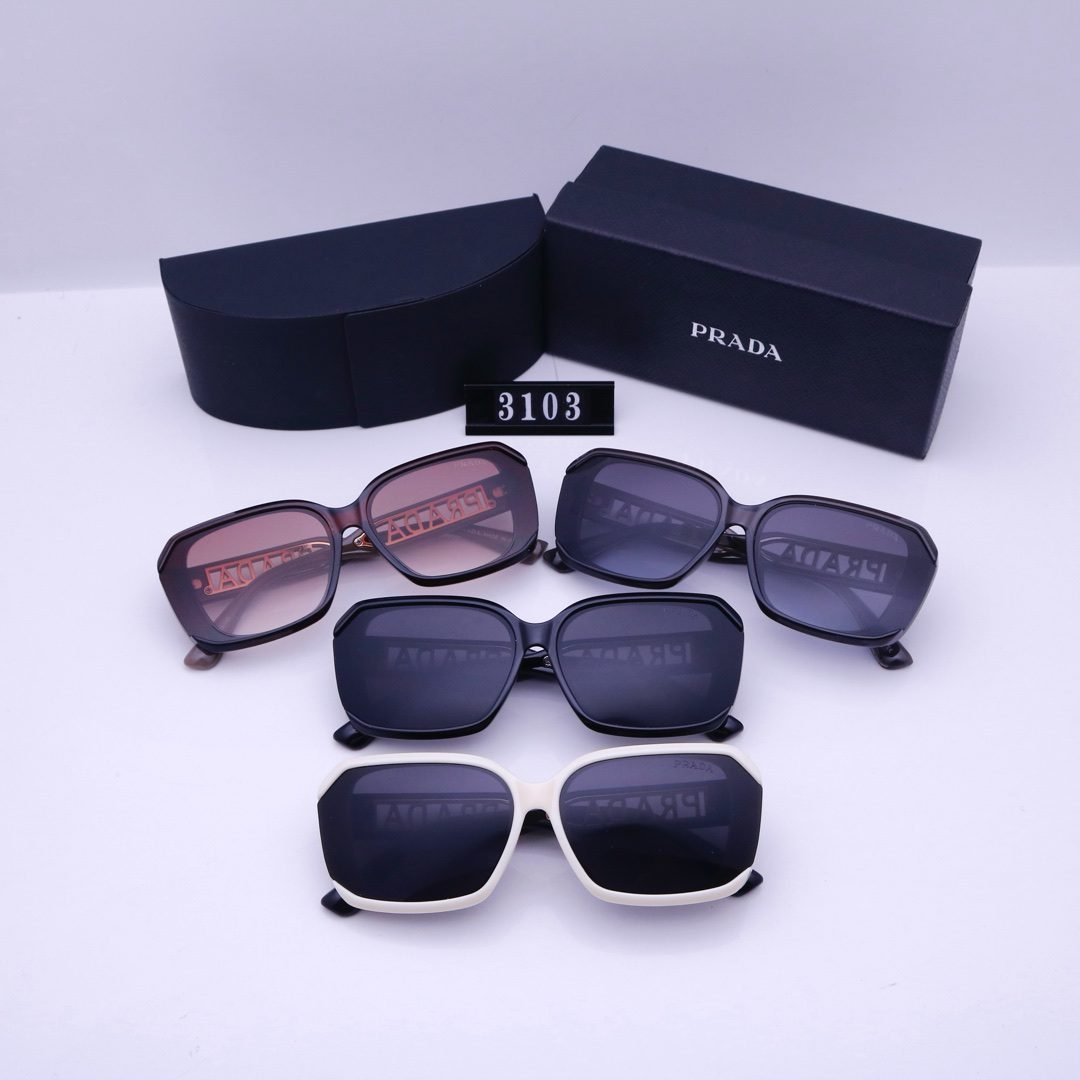 Elevate your accessory collection with Prada’s square sunglasses (Model 3103). Featuring stylish square frames, they come in a range of elegant options—from gradient brown and sleek dark gray lenses to a chic white – framed style, all showcasing the iconic Prada branding on the lenses.
