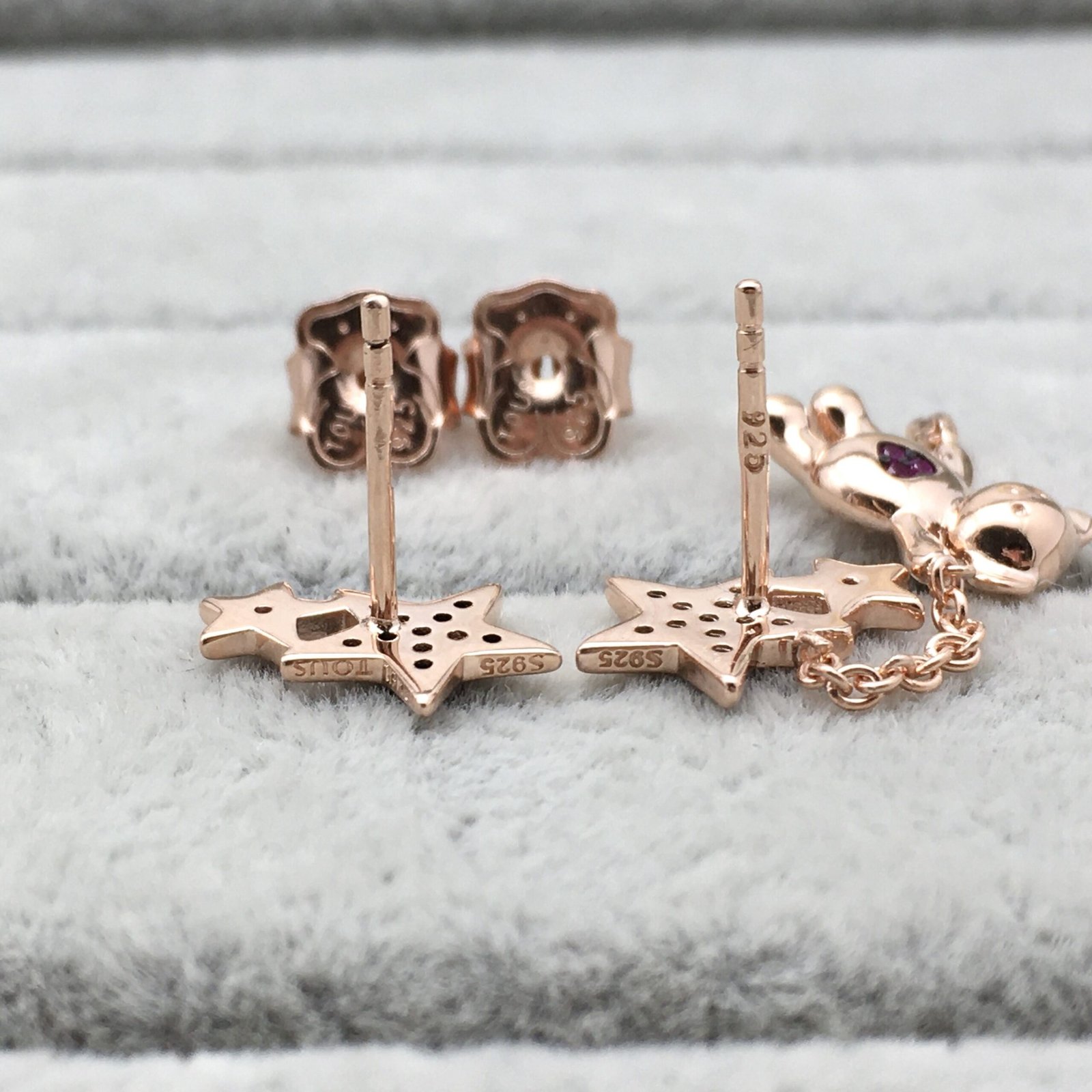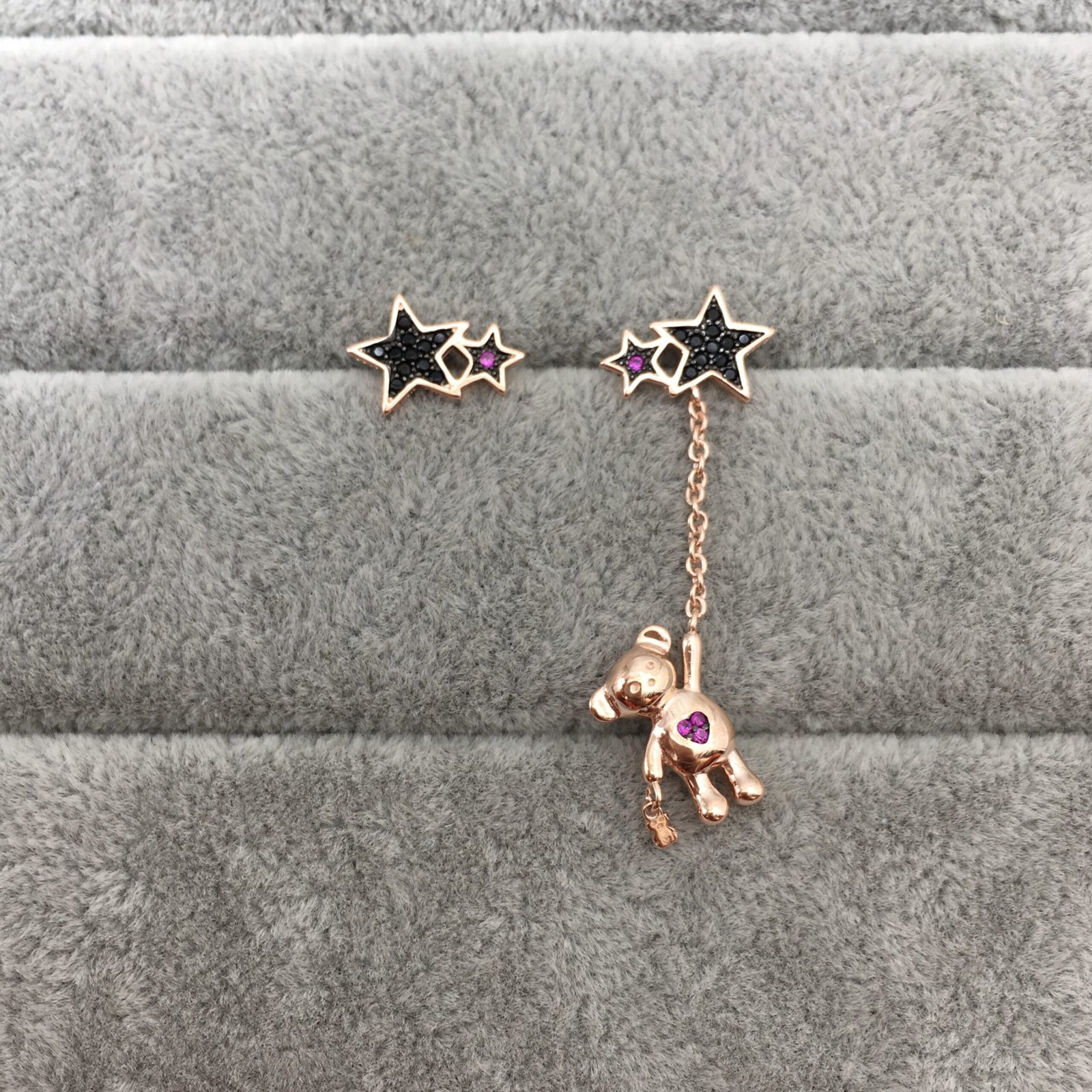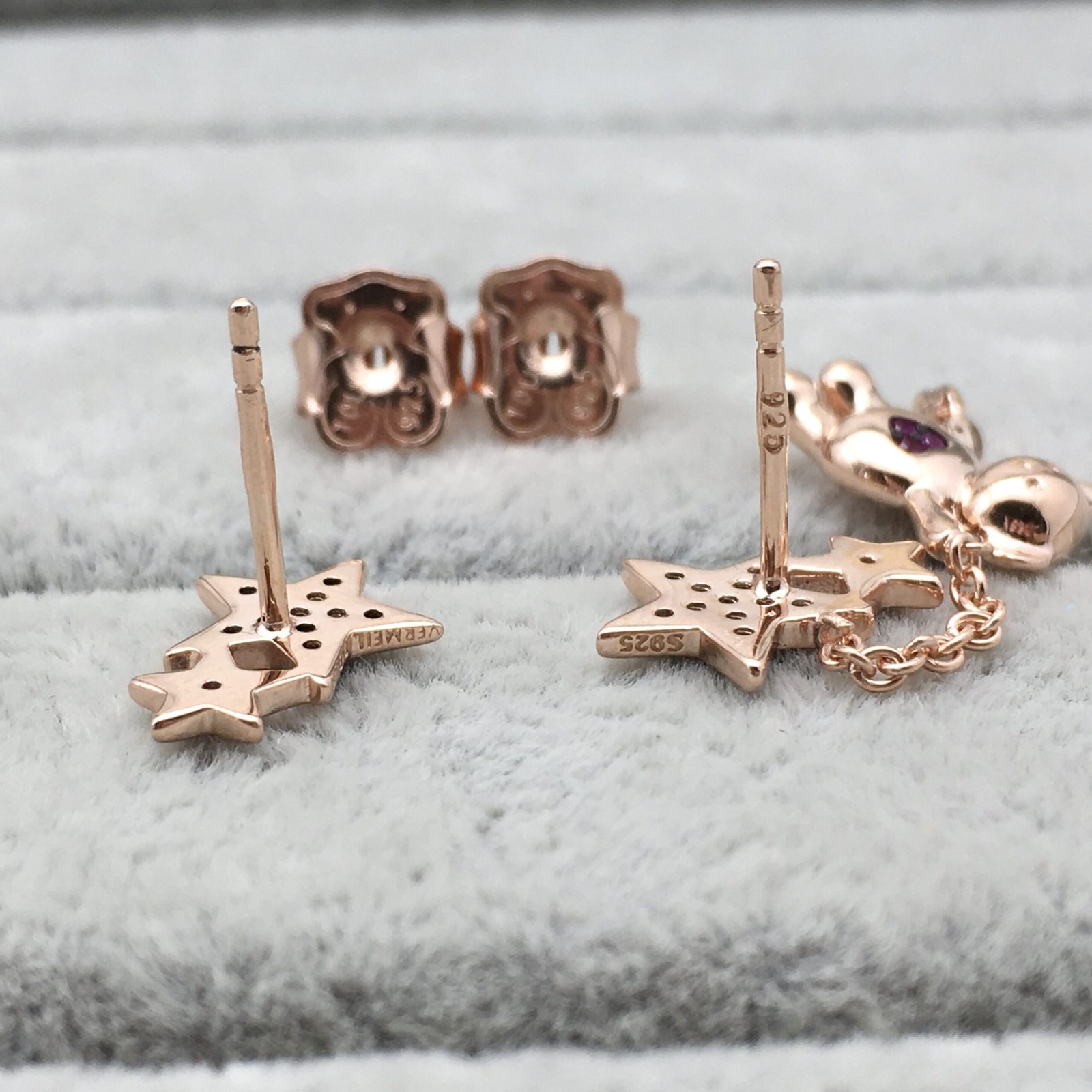 Short/long Rose Silver Vermeil Teddy Bear Stars Earrings with Spinel and Ruby