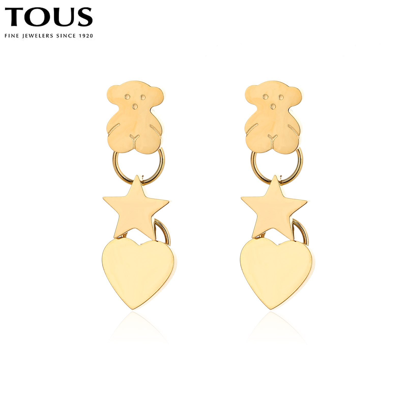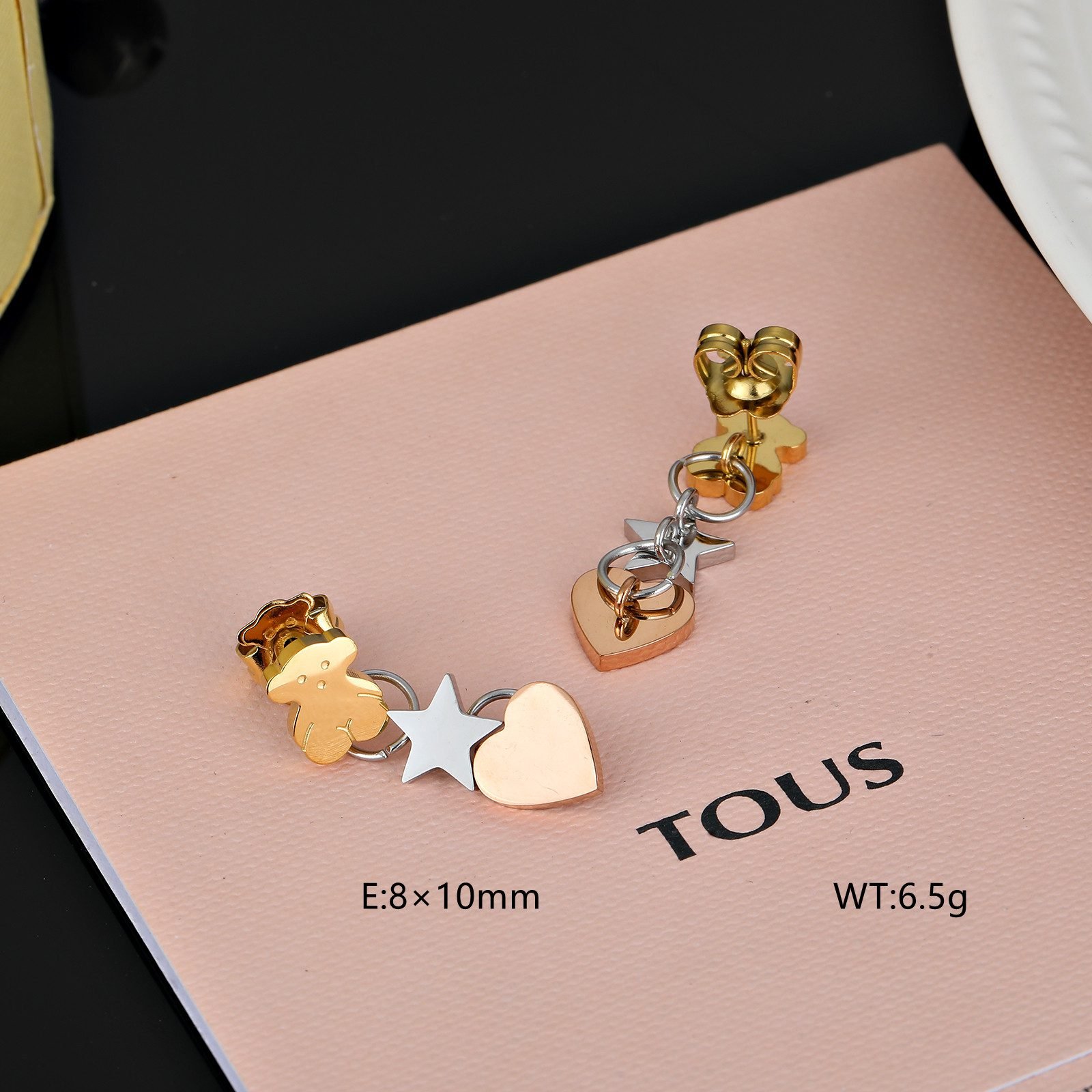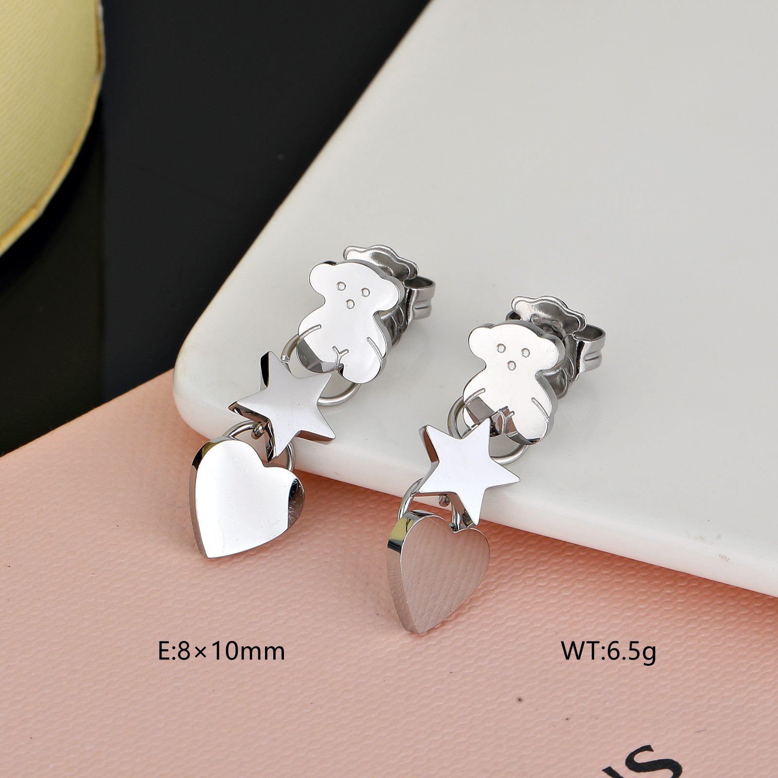 Vertical arrangement, clear hierarchy: The earrings adopt a vertical arrangement design, with the Spanish bear, star, and heart arranged from top to bottom, with clear hierarchy and visual effect. This arrangement not only breaks the traditional flat layout of earrings, but also adds a three-dimensional and dynamic feeling, making it unforgettable at first glance.