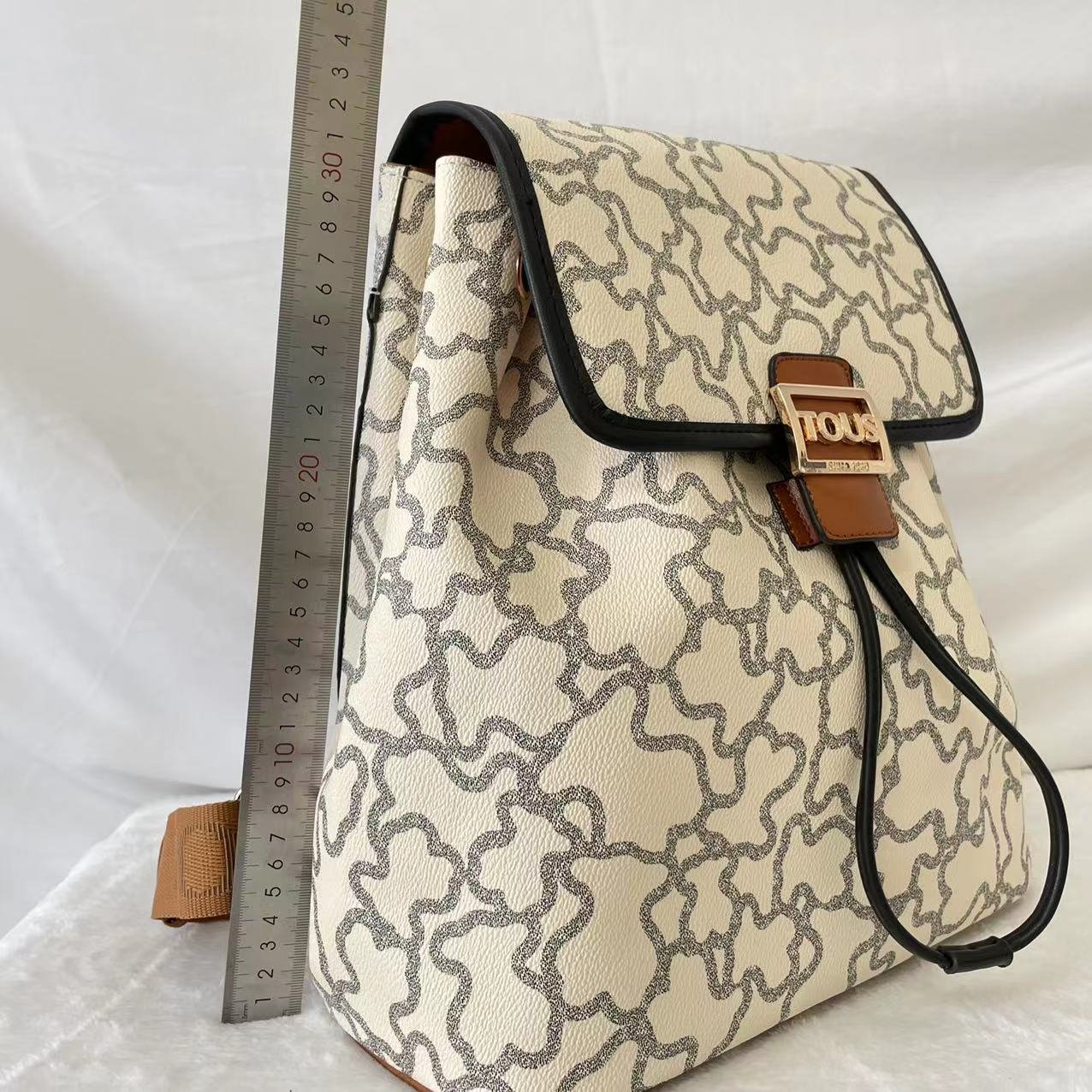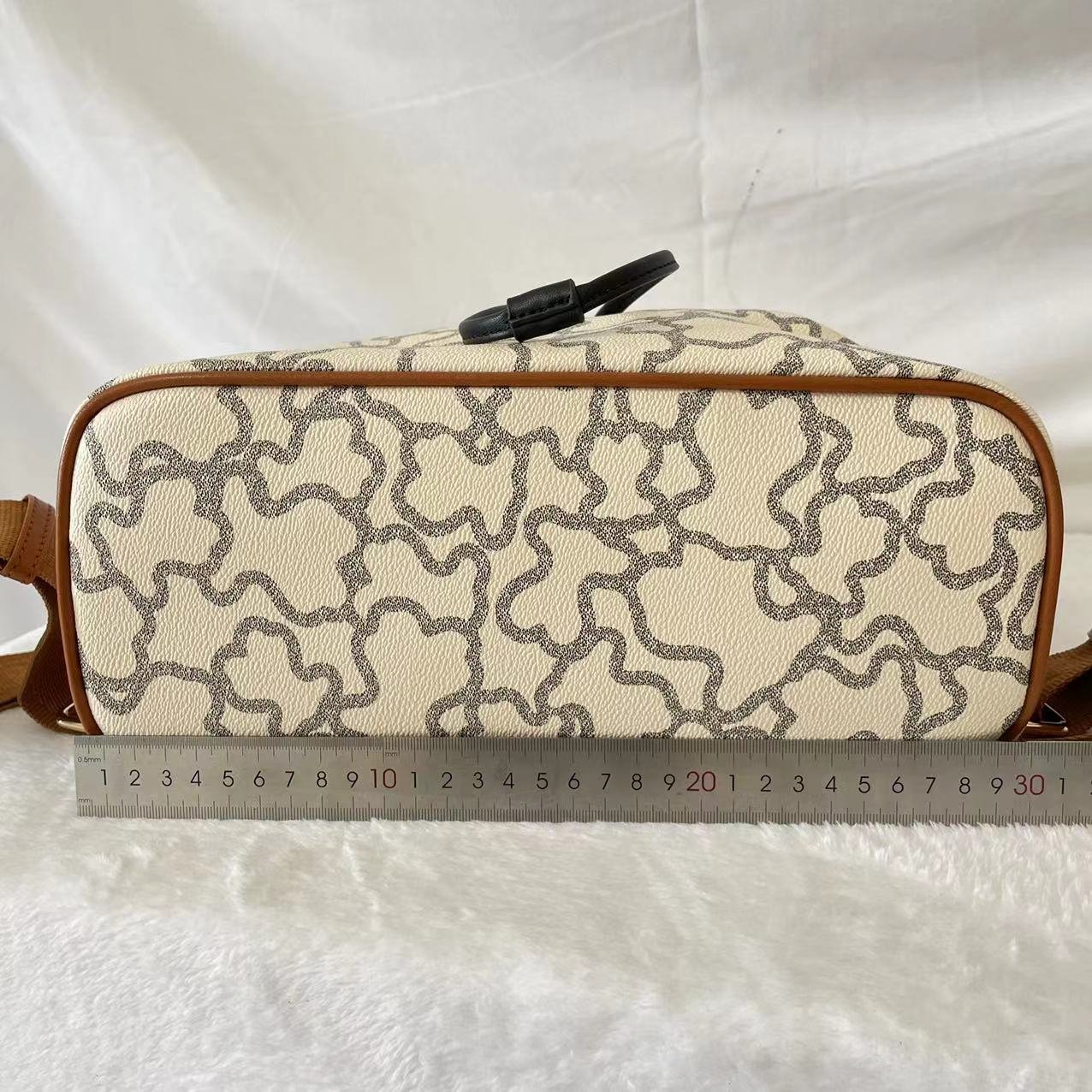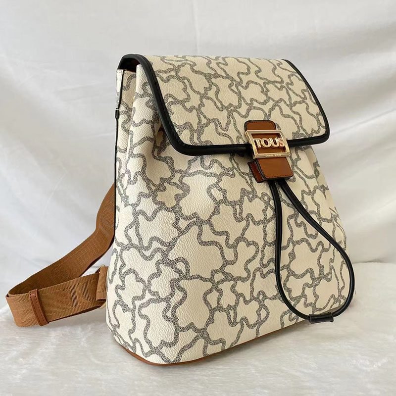 TOUS backpack canvas backpack with beige and gray Kaos print and synthetic leather trim. Main compartment with magnetic flap closure and adjustable drawstring. Outside pocket with zipper closure and open pocket inside. Fixed handle and adjustable shoulder straps.  Measurements :32*30*15cm