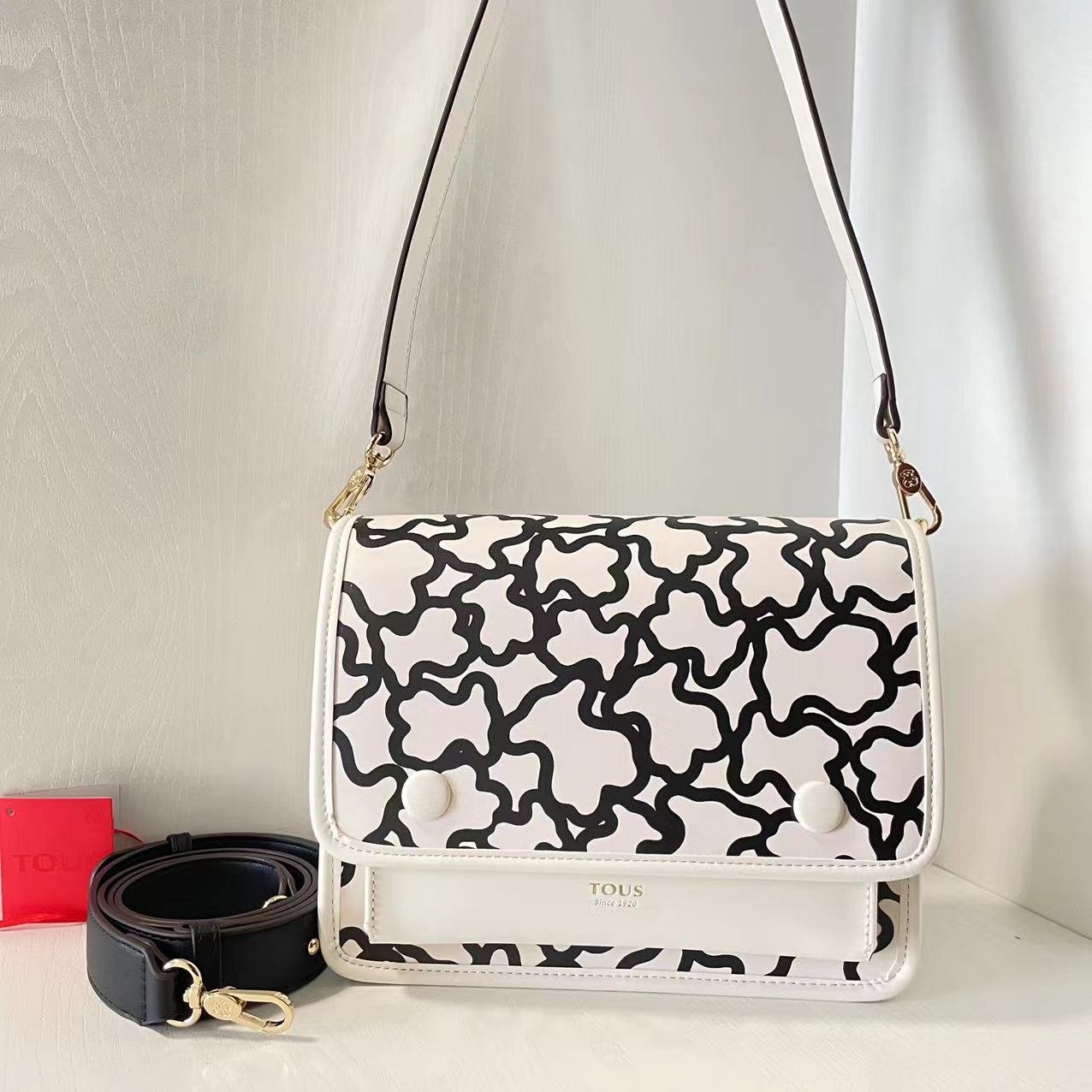 Tous leather medium white and black Kaos Icon printed crossbody bag. There are multiple inner pockets, magnetic buckle openings, adjustable and detachable shoulder straps, and a handbag inside. Measurements: 24.5 * 9 * 20.5cm