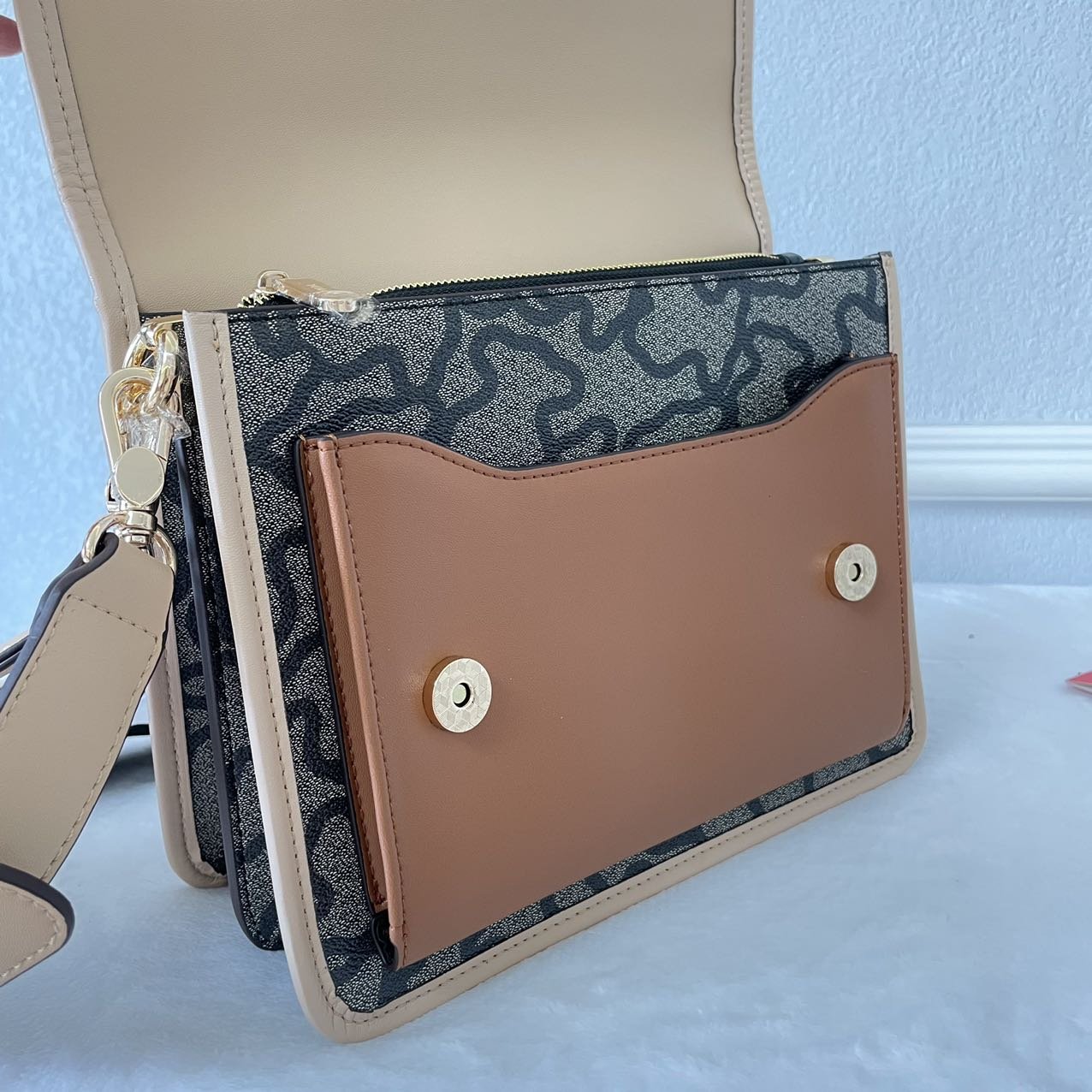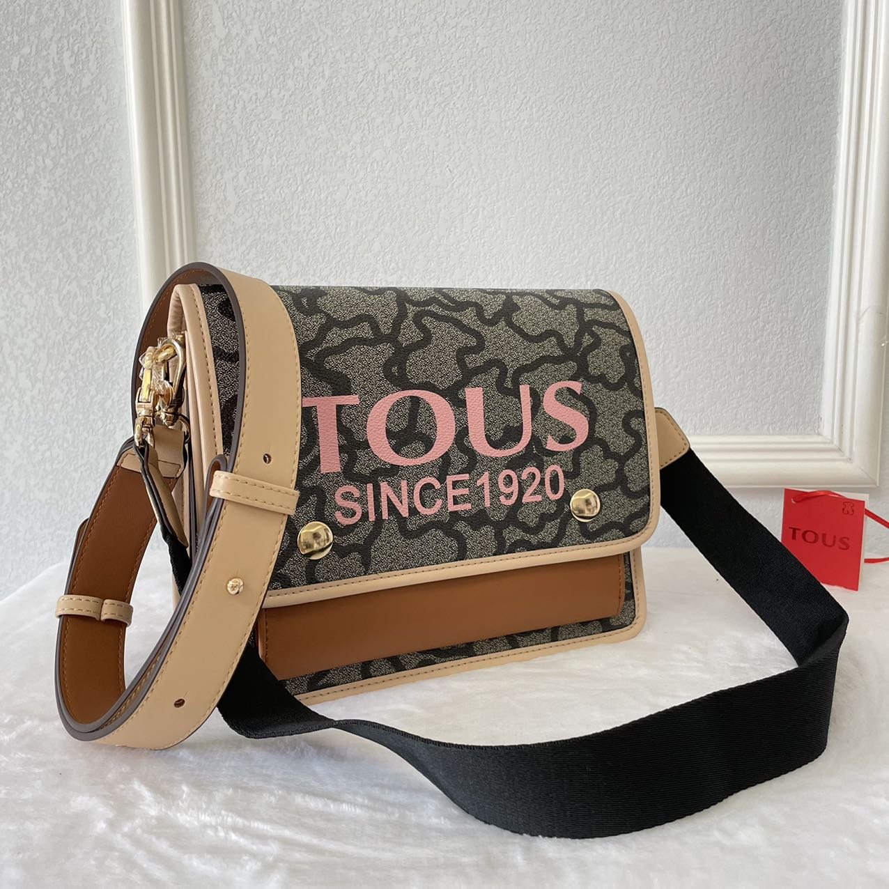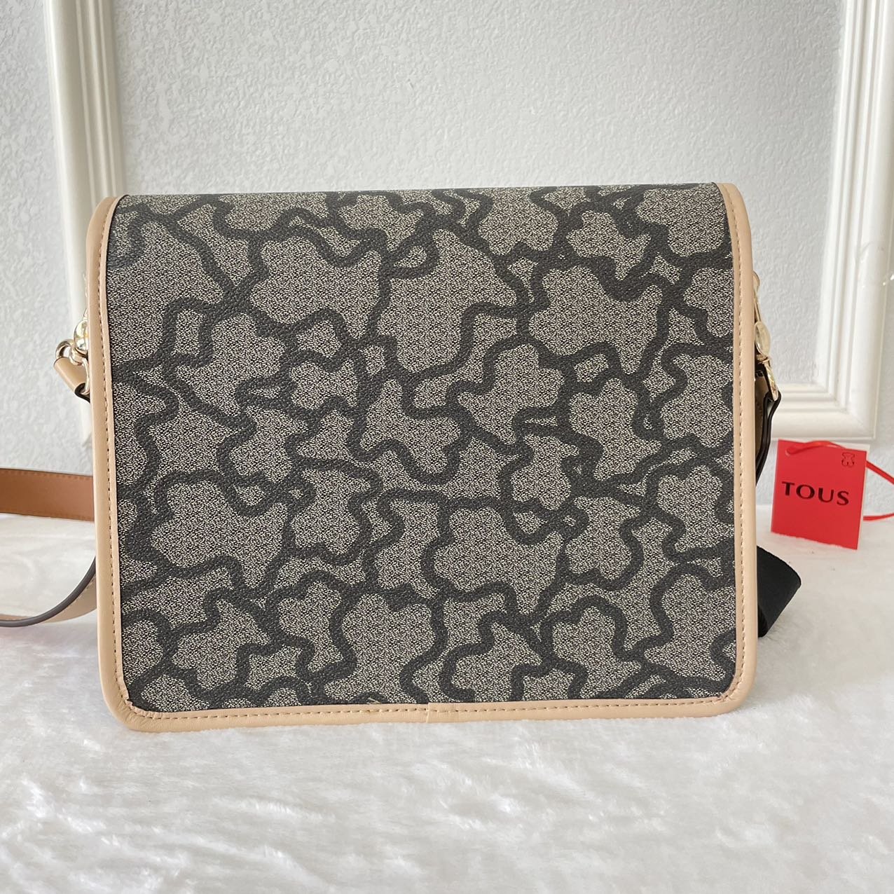 Medium TOUS Kaos Icon Audree crossbody bag in black canvas with Kaos print and synthetic leather trim. Handbag with two compartments separated by a zipped pocket and an open pocket on the front. Flap closure with two magnetic buttons. Shoulder strap detachable with snap hooks and adjustable and detachable crossbody strap. Measurements :24.5*9*20.5cm