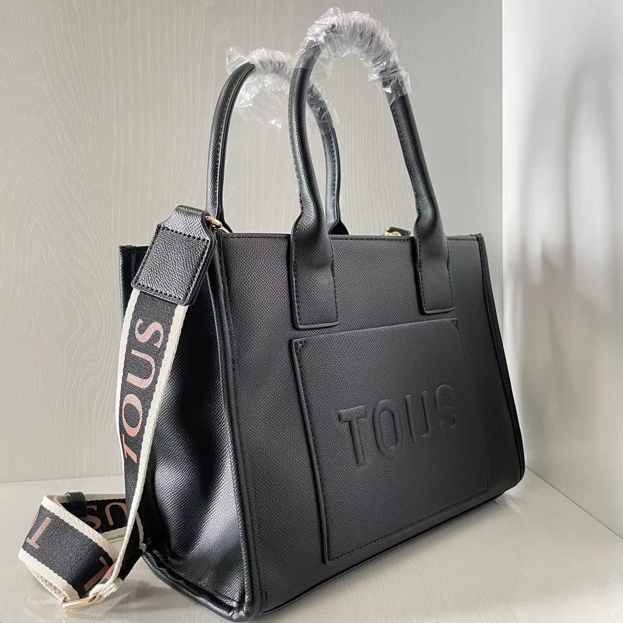 TOUS Medium Black La Rue Amaya Synthetic Leather Shopping Bag. Magnetic buttons open and close. Open the front pocket. There is a zippered pocket inside and two open pockets. Secure the handle and shoulder strap. Measurements: 28 * 13 * 22cm