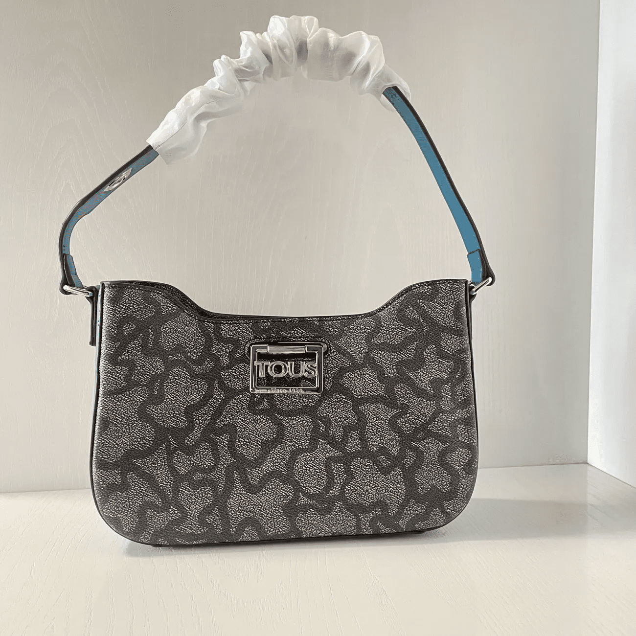 TOUS Medium Blue and Black Kaos Icon Printed Shoulder Bag Underarm Bag. Made of waterproof canvas, combined with leather effect vinyl, the shoulder strap is non adjustable, and the zipper opens and closes. There are multiple interlayers inside. Measurements: 25 * 7 * 16.5cm