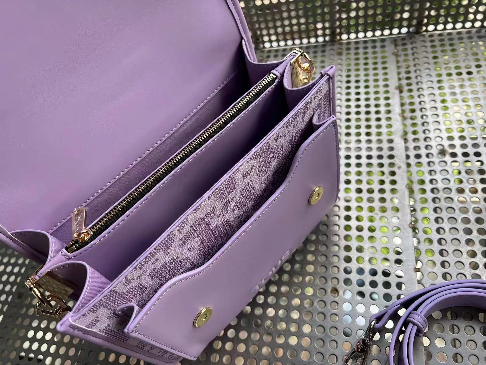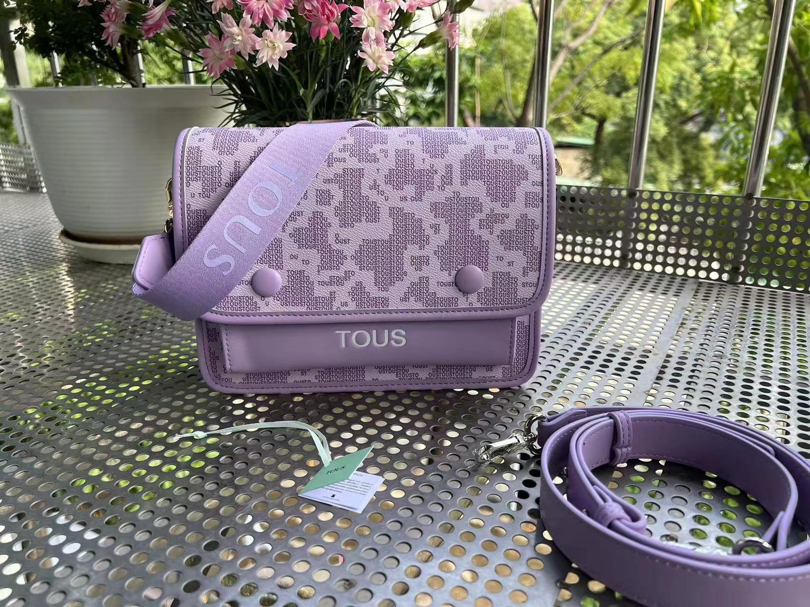 Tous medium purple and white Kaos Icon printed crossbody handbag. There are multiple inner pockets, magnetic buckle openings, adjustable and detachable shoulder straps, and a handbag inside. Measurements: 24.5 * 10 * 20.5cm