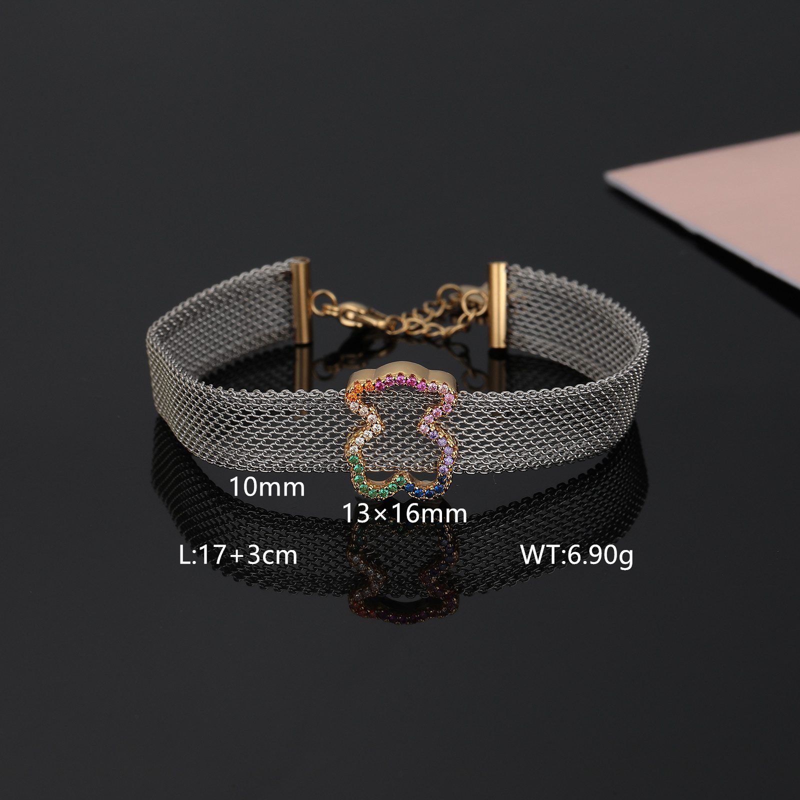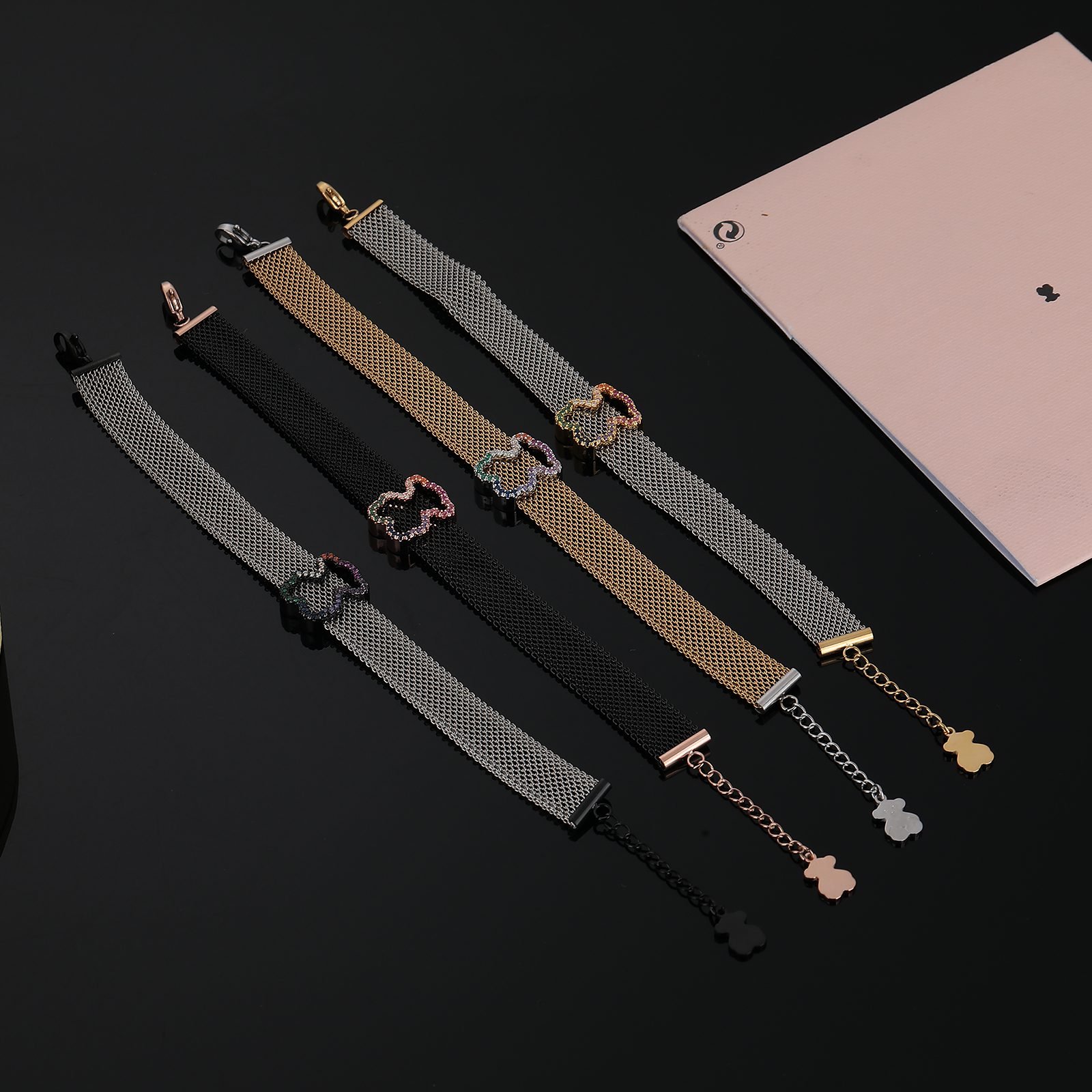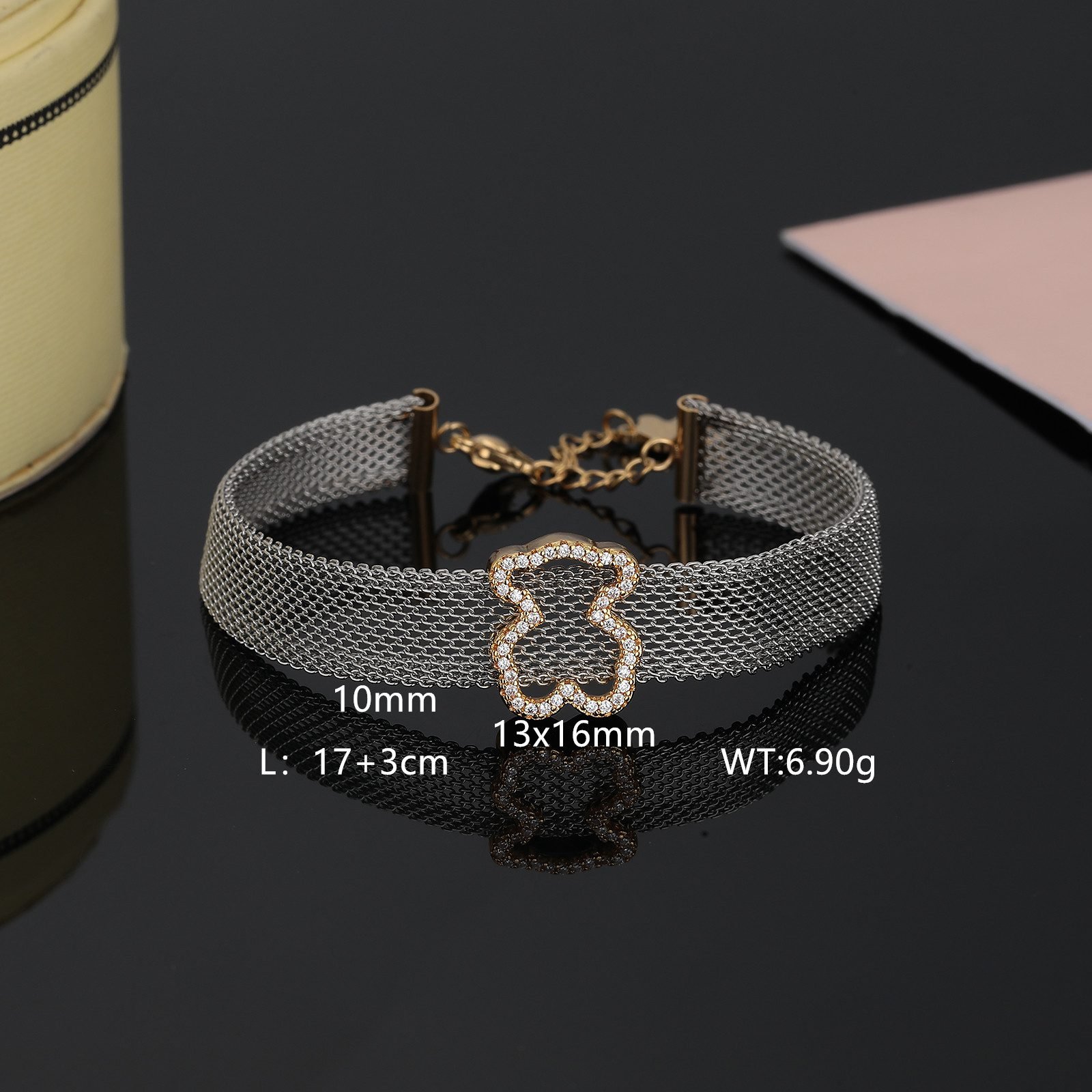 TOUS presents this dazzling Crystal Spirit stainless steel transparent zircon frame teddy bear bracelet with endless creativity and exquisite craftsmanship. It is not only a bright color on your wrist, but also an extension of your unique charm, making every move and gesture emit a dazzling light. The selection of high-quality stainless steel as the main material ensures the durability and lightweight comfort of the bracelet. The unique luster and texture of stainless steel lay the foundation for fashion and elegance in bracelets. The transparent zircon embedded on it, with its crystal clear and dazzling characteristics, adds endless brilliance and agility to the bracelet. Transparent Zircon Frame: The core design of the bracelet lies in the carefully crafted transparent zircon frame, which is arranged in a staggered manner, as if condensing scattered starlight between the wrists, emitting a charming glow. The purity and clarity of transparent zircon make people feel its extraordinary texture and charm at a glance.