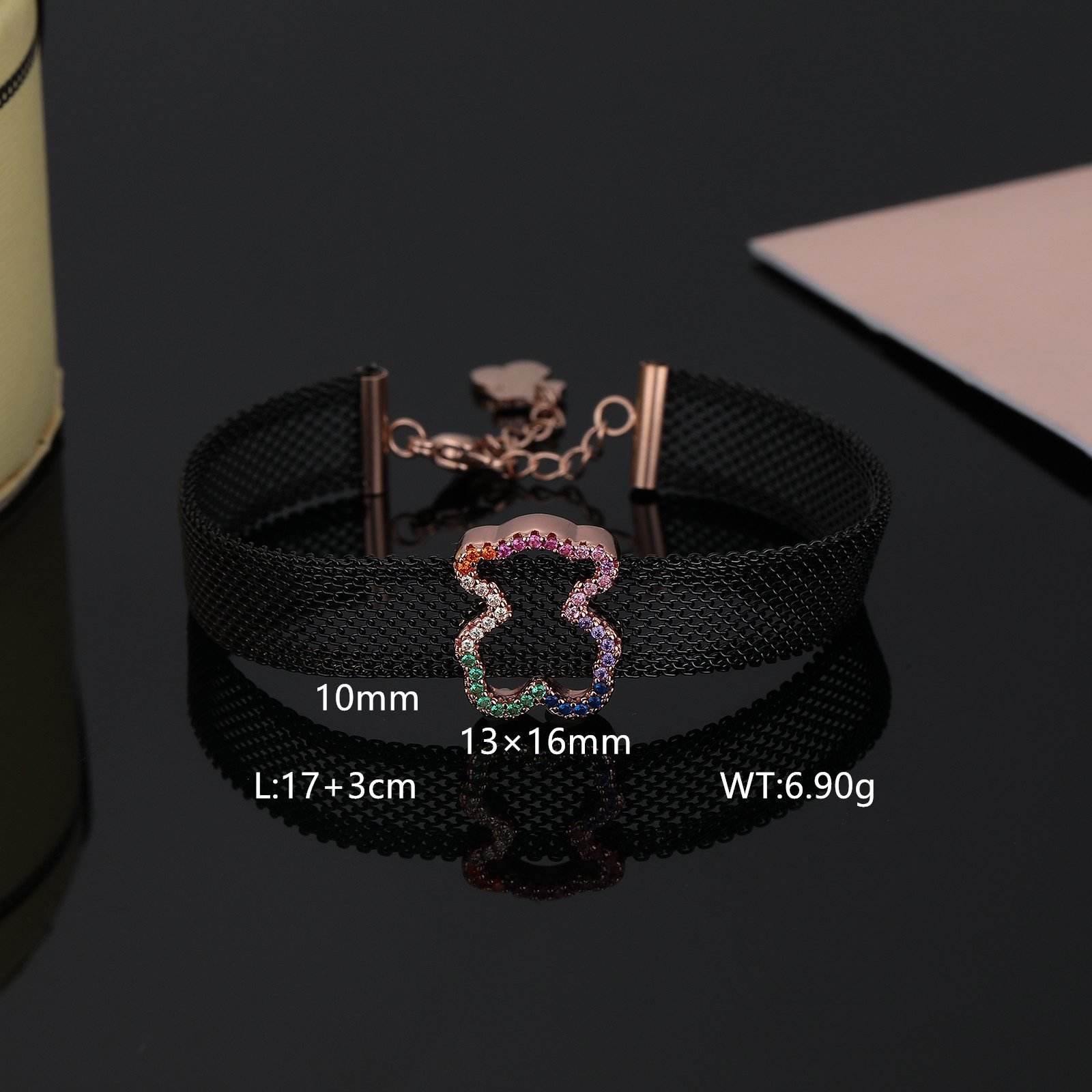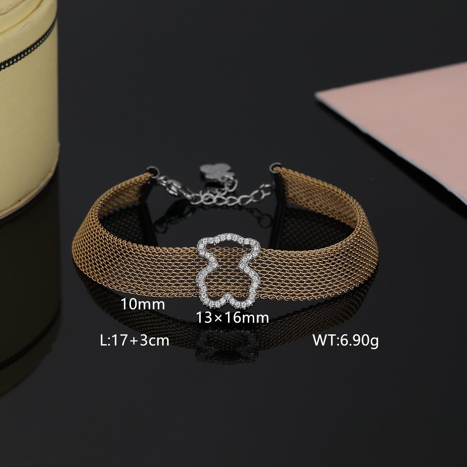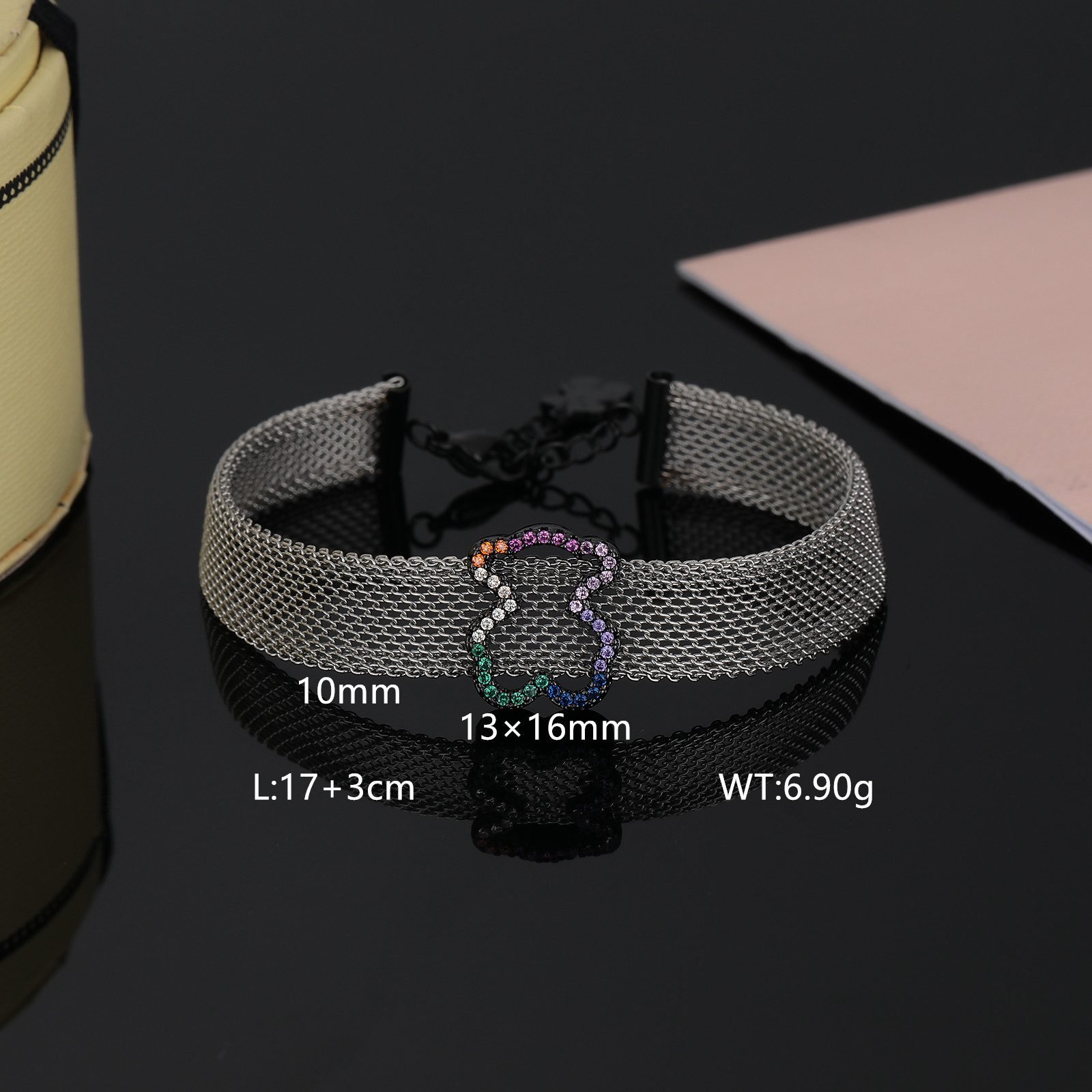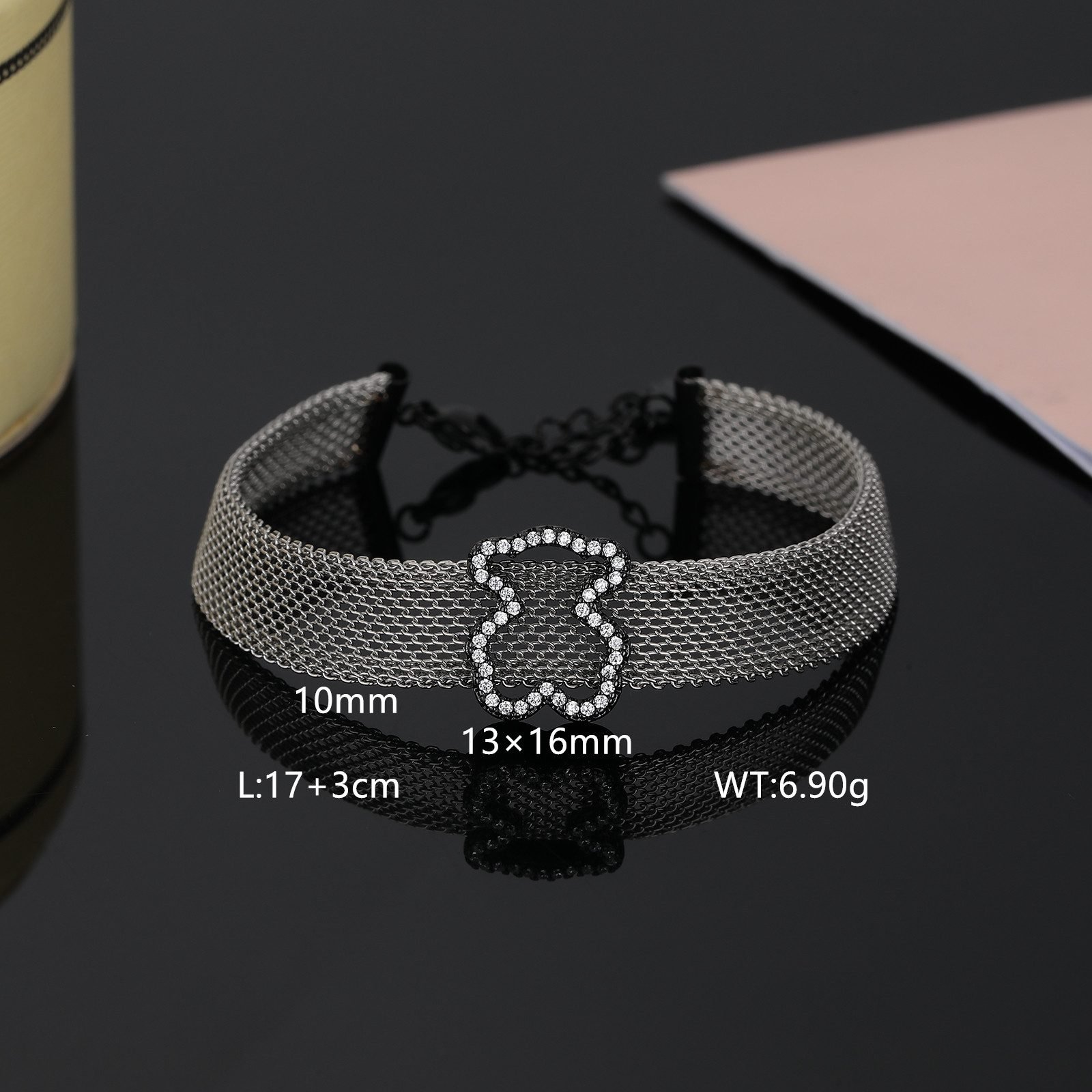 TOUS presents this dazzling Crystal Spirit stainless steel transparent zircon frame teddy bear bracelet with endless creativity and exquisite craftsmanship. It is not only a bright color on your wrist, but also an extension of your unique charm, making every move and gesture emit a dazzling light. The selection of high-quality stainless steel as the main material ensures the durability and lightweight comfort of the bracelet. The unique luster and texture of stainless steel lay the foundation for fashion and elegance in bracelets. The transparent zircon embedded on it, with its crystal clear and dazzling characteristics, adds endless brilliance and agility to the bracelet. Transparent Zircon Frame: The core design of the bracelet lies in the carefully crafted transparent zircon frame, which is arranged in a staggered manner, as if condensing scattered starlight between the wrists, emitting a charming glow. The purity and clarity of transparent zircon make people feel its extraordinary texture and charm at a glance.