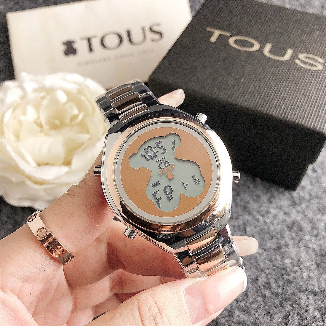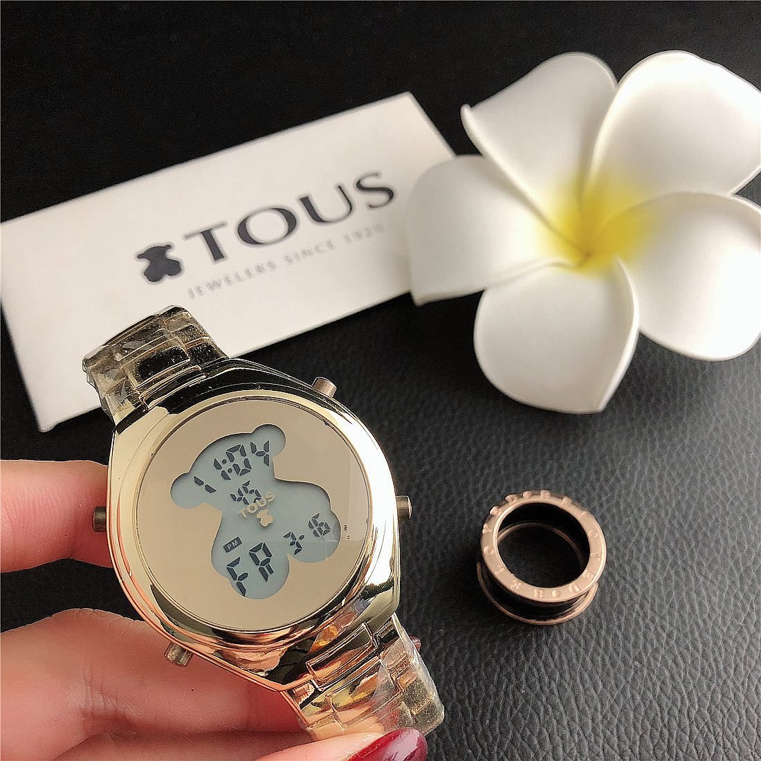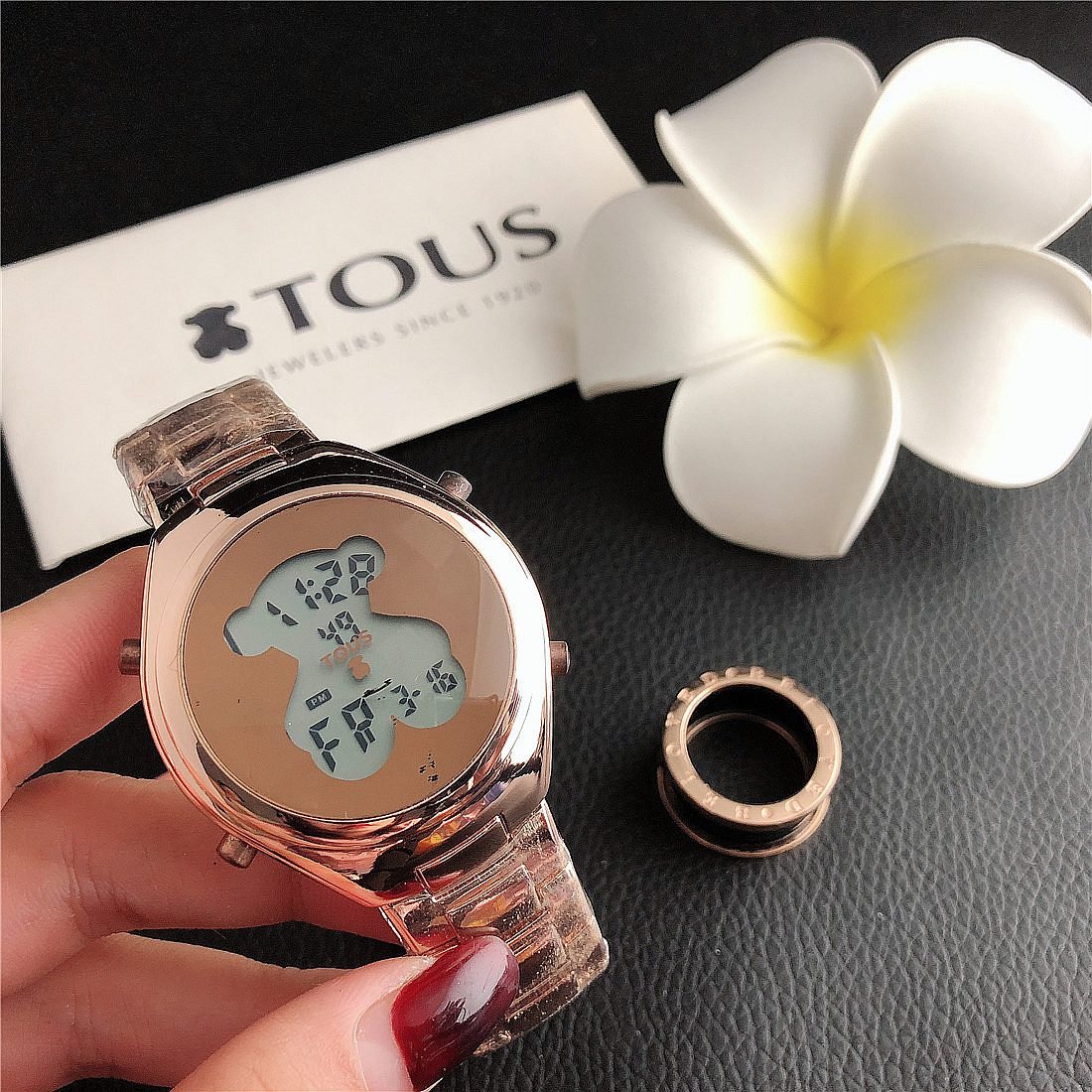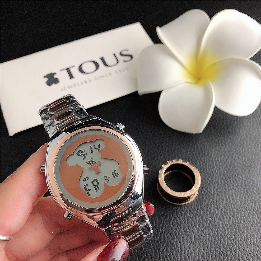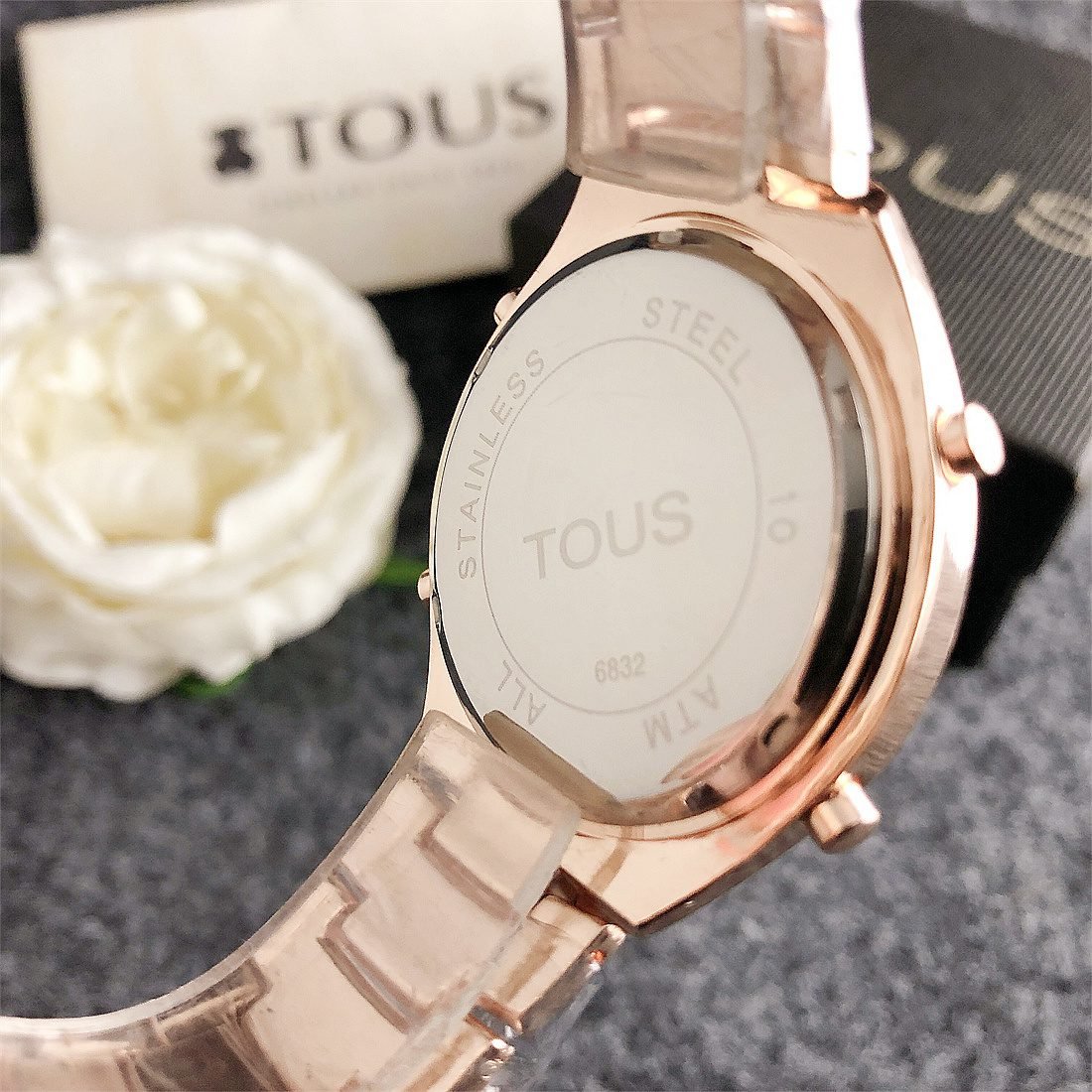 The central position is printed with a peach bear pattern, which is the logo of the TOUS brand, adding unique personality and recognition to the watch.